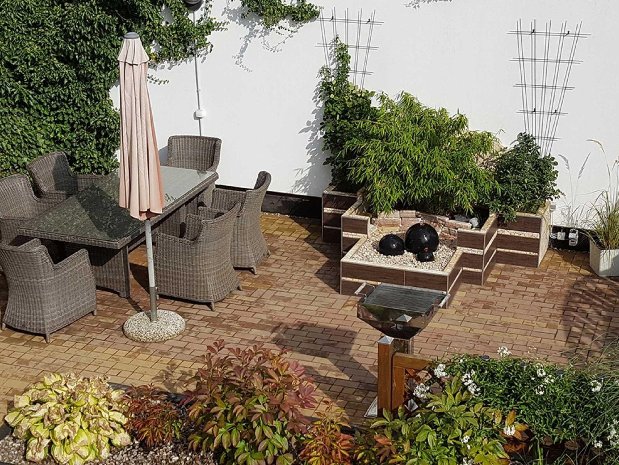Die große, nach Süden ausgerichtete, Terrasse mit Sitzmöbeln und Grillmöglichkeit befindet sich gegenüber der Wohnung und bietet viel Platz zum Erholen.