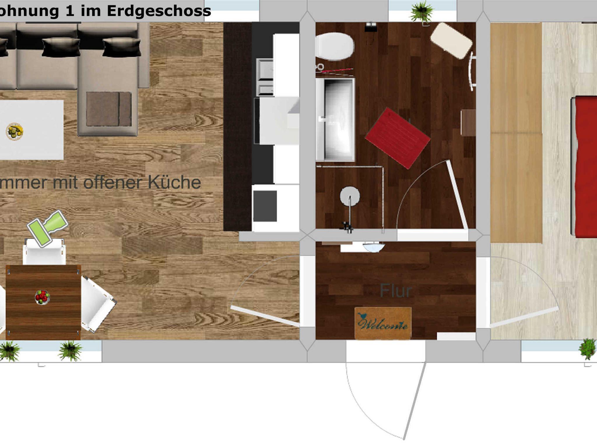 Die Wohnung verfügt über ein Schlafzimmer mit Boxspringbett (1,80 x 2,00 m), ein Bad mit ebenerdiger Dusche und einen Wohnraum mit einer gemütlichen Relax- Couch sowie einen großen LED-TV. Die offene Küchenzeile schließt sich direkt an den Wohnraum an. Sie verfügt über einen Backofen mit 4 Platten-Ceranfeld, Mikrowelle, Geschirrspüler, Kühlschrank mit Gefrierfach u.v.m.
