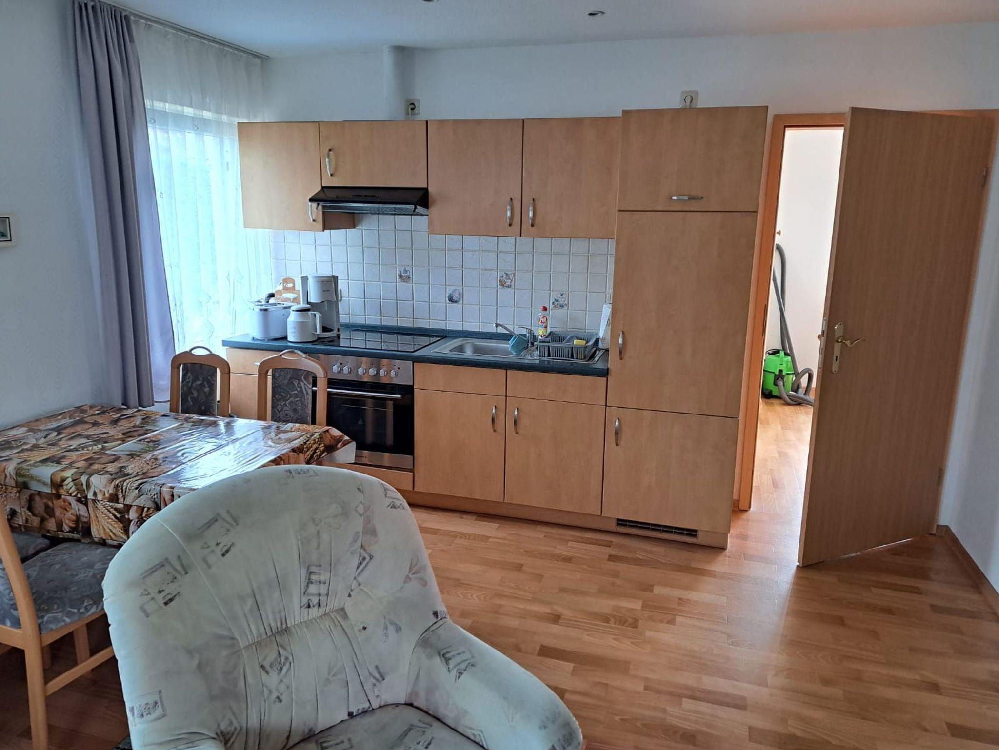 Die Ferienwohnung 1 befindet sich im Erdgeschoss des Ferienhauses. Sie finden ein geräumiges Wohnzimmer mit Couchgarnitur, Flachbild TV, Radio und CD Player. Die angrenzende Wohnküche bietet mit Backofen, Ceranherd und Kühlschrank mit Gefrierfach ansprechenden Komfort. Am seperaten Esstisch können Sie Ihre Mahlzeiten einnehmen. Ein Wasserkocher, Toaster und Kaffeemaschine gehören selbstverständlich zur Ausstattung.
