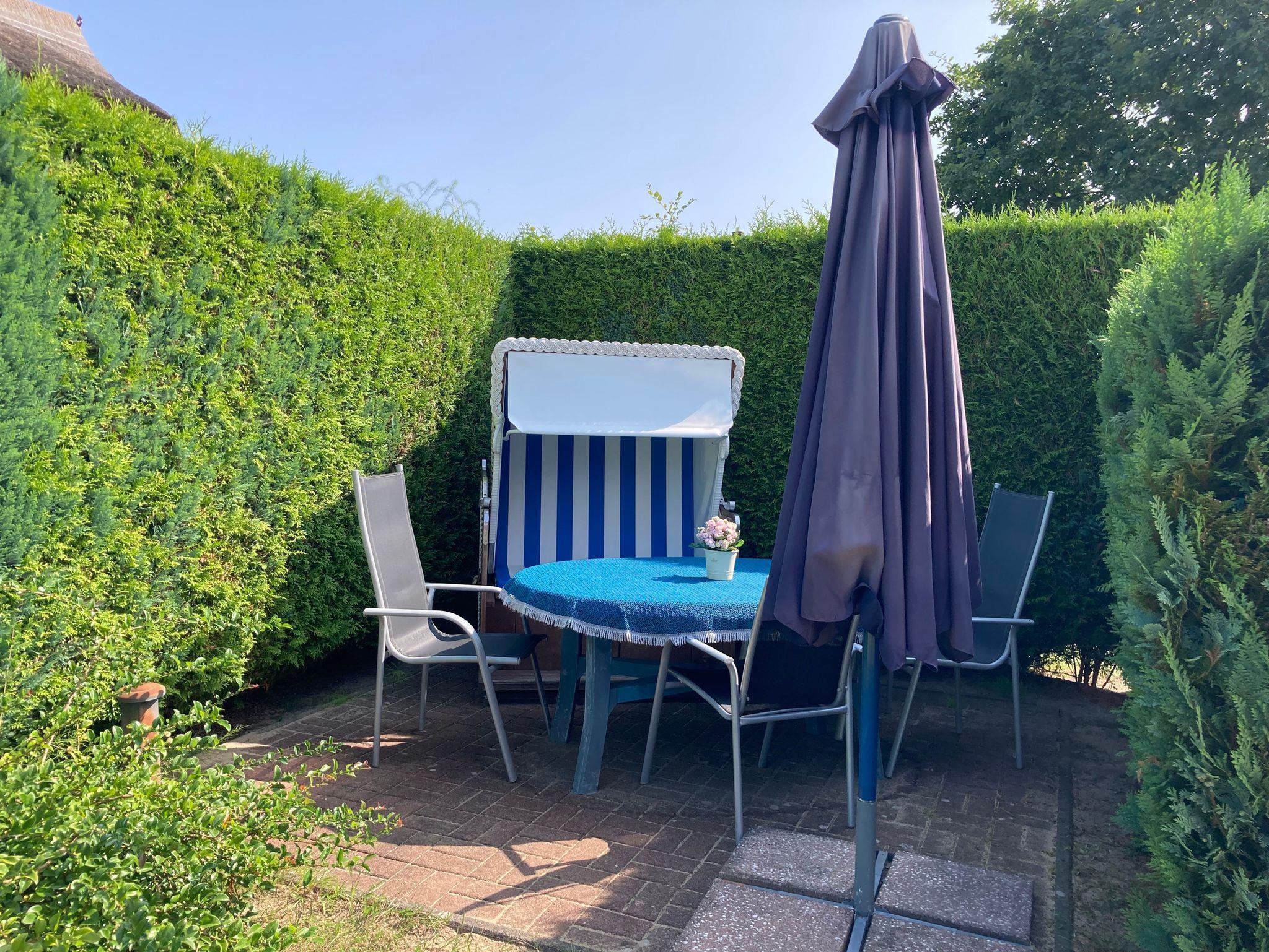 Die Terrasse mit Strandkorb und Gartenmöbeln bietet ausserdem die Gelegenheit abends zu grillen. Bettwäsche kann für 5,00€ p.Person dazugebucht werden, Handtücher sind mitzubringen.