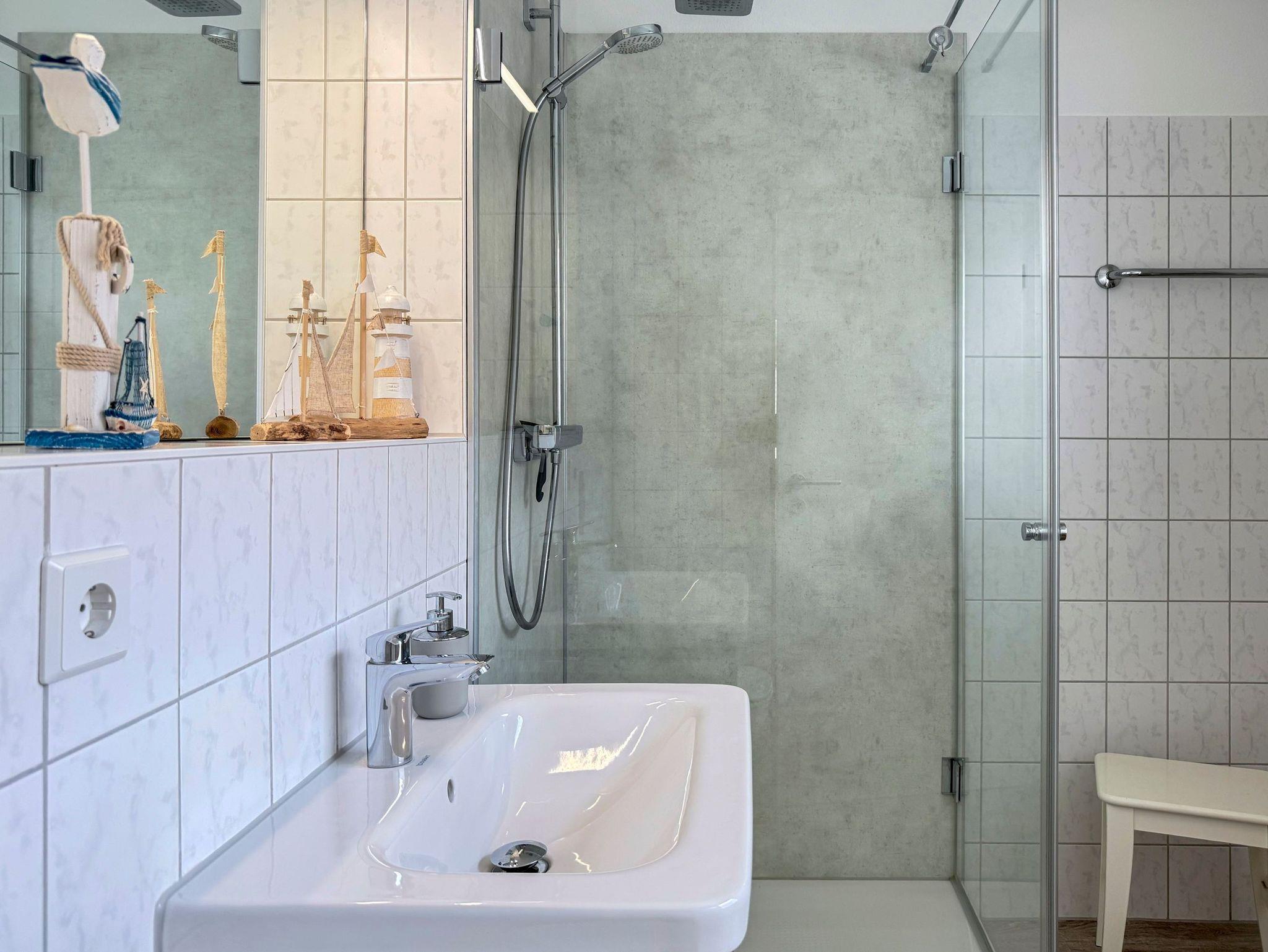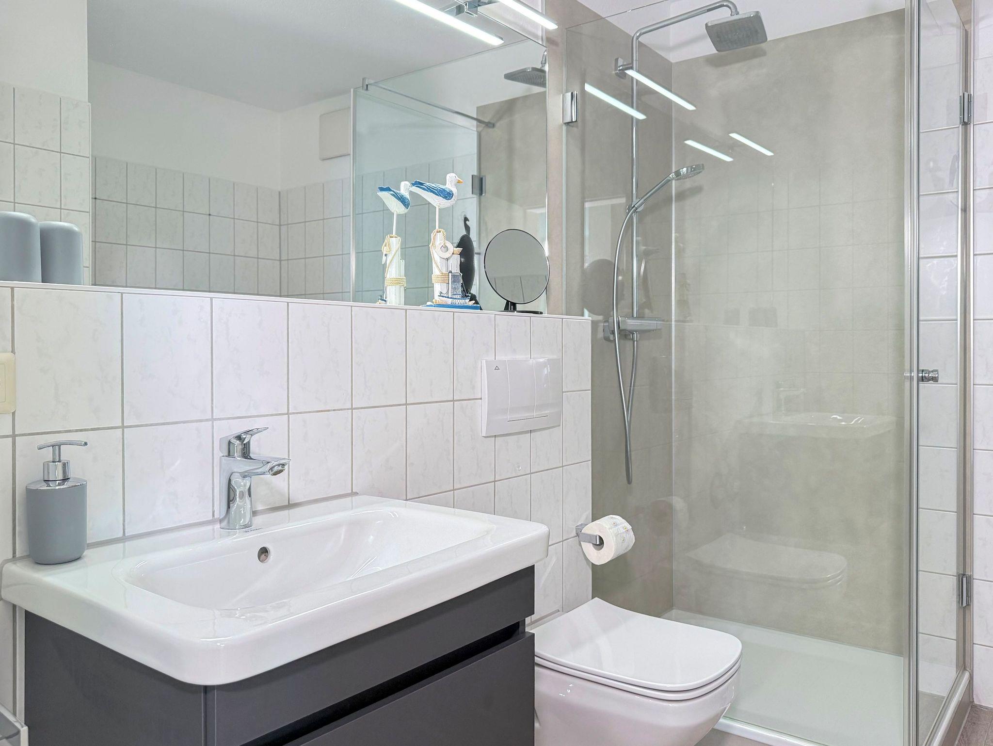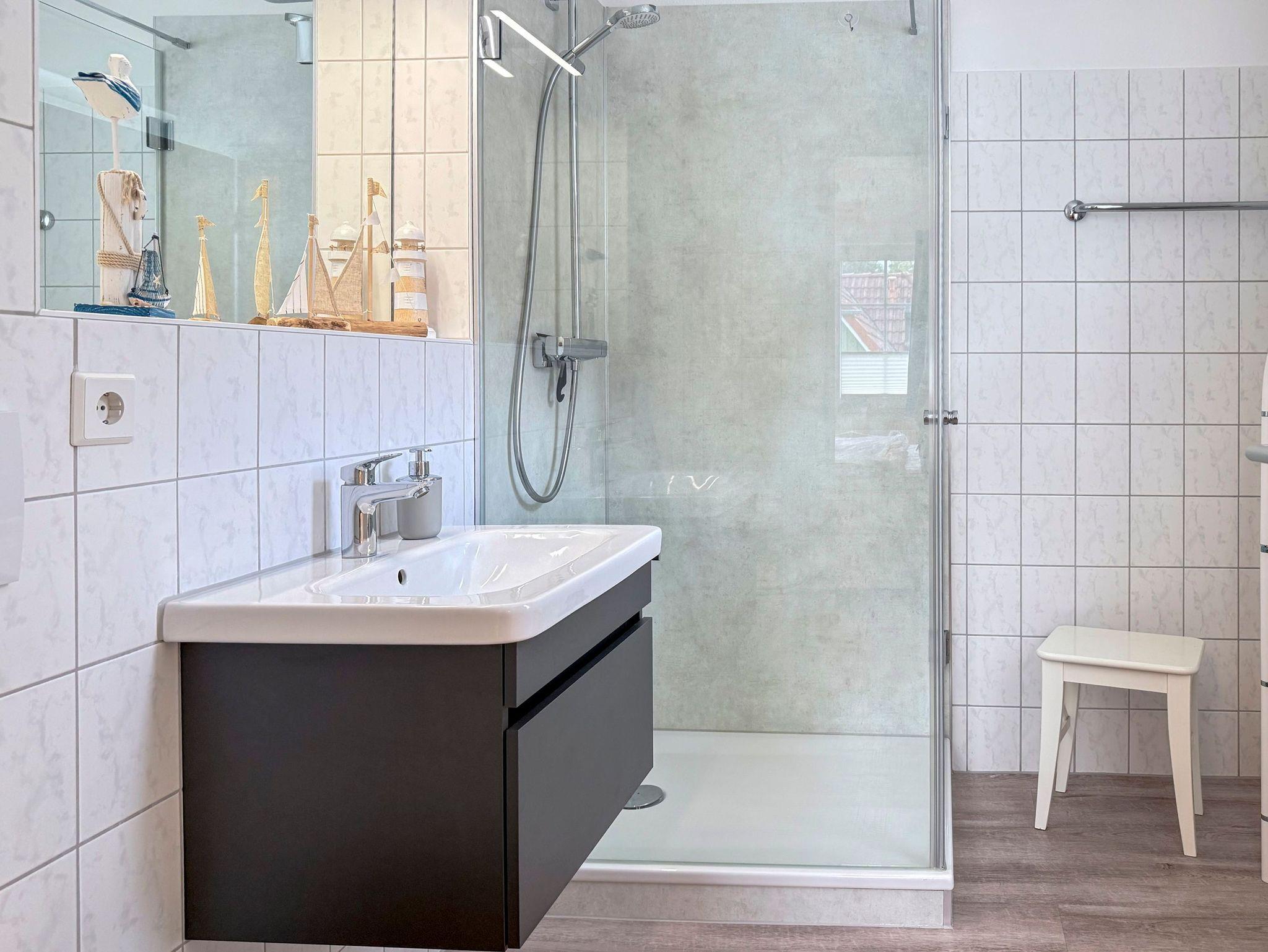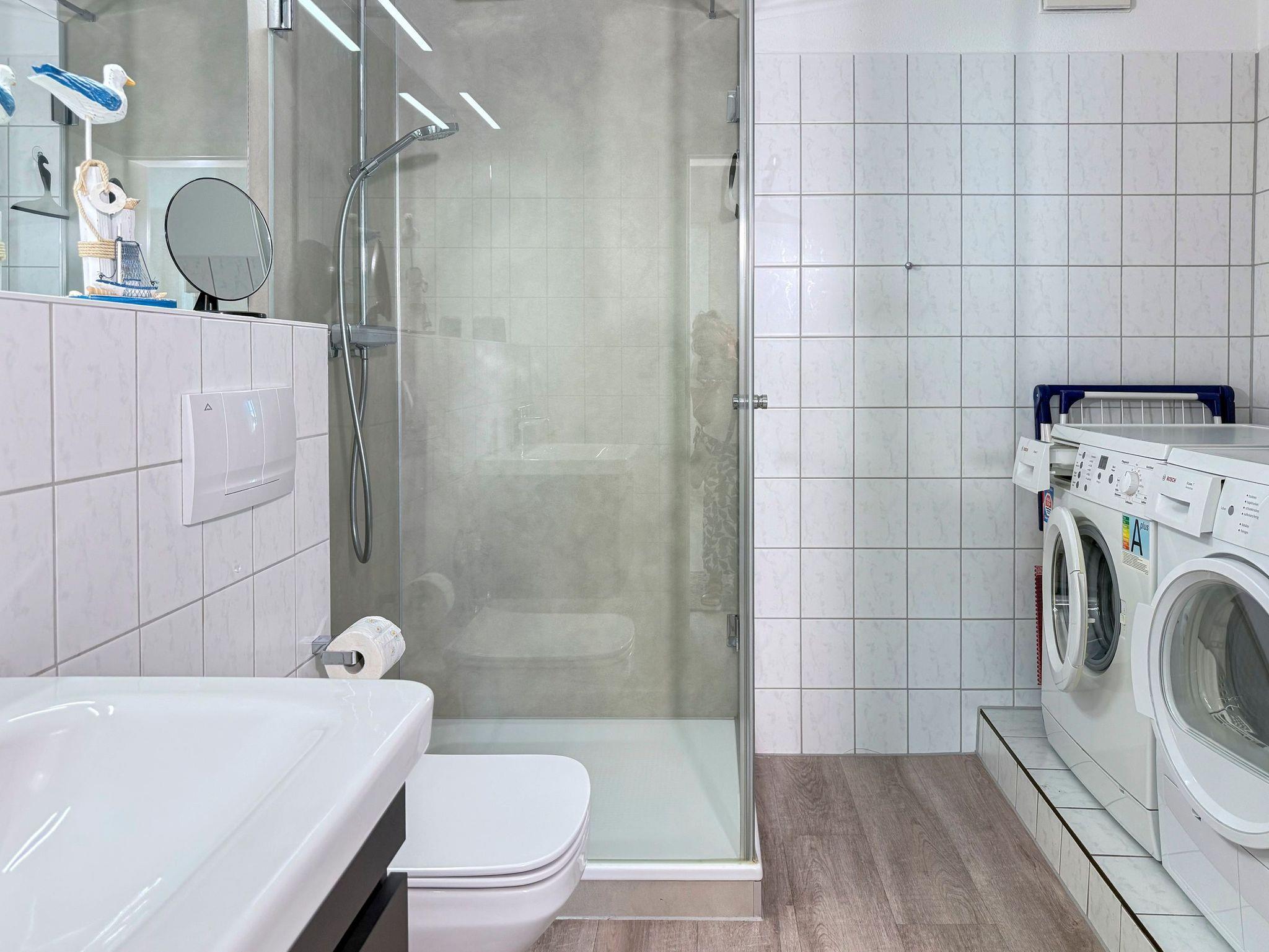 • Badezimmer: Mit ebenerdiger Dusche und Waschmaschine.