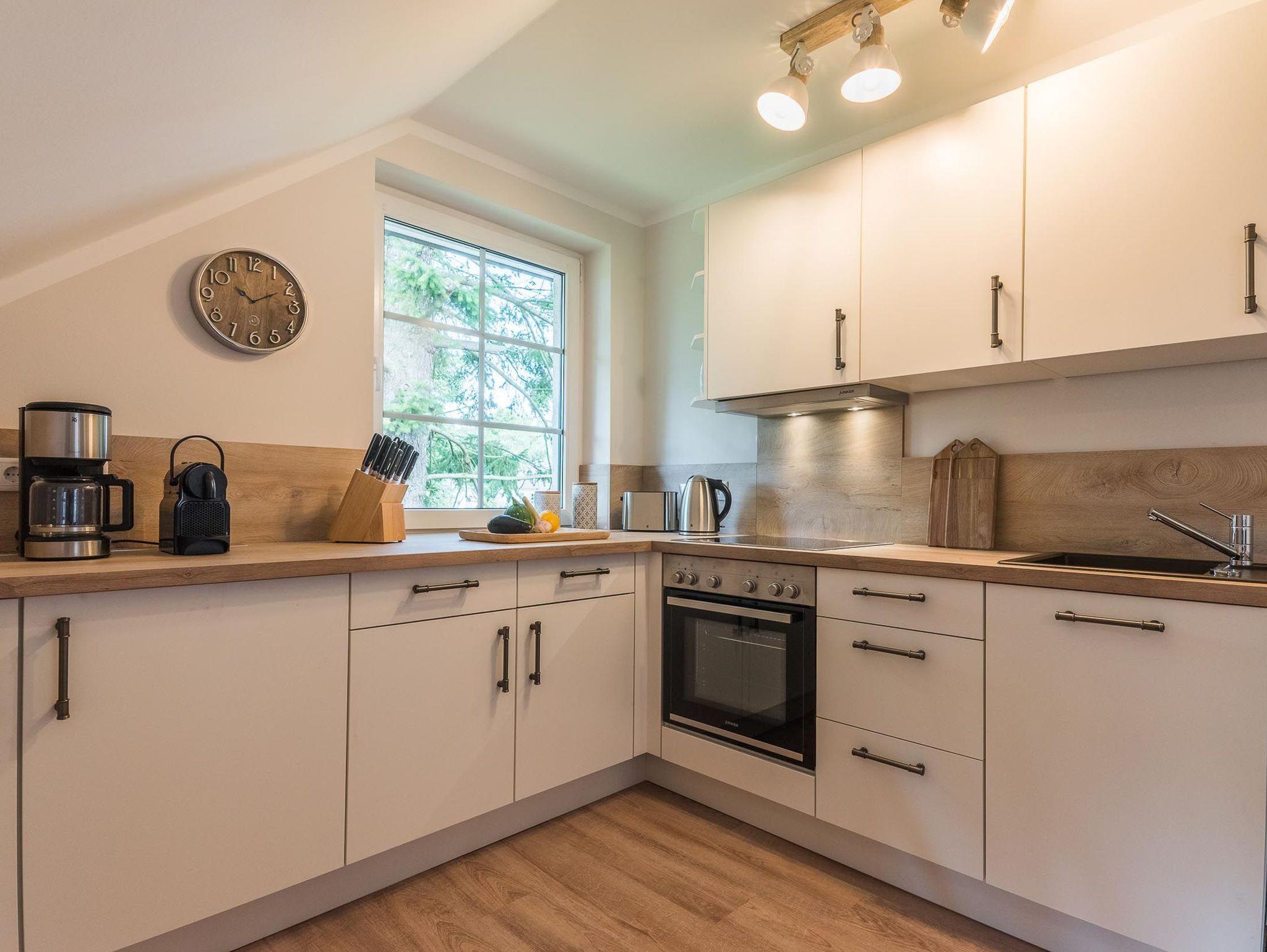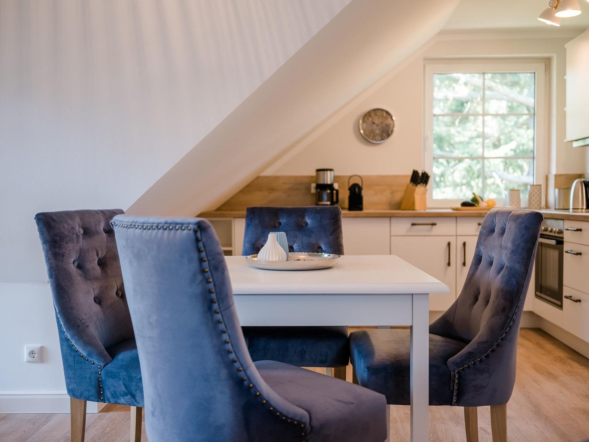 Der trotz des Dachgeschosses helle Wohnbereich diese Appartments umfasst eine urgemütliche Relaxcouch zum Entspannen sowie mit einer Schlaffunktion für zwei Personen. Der separate Essbereich grenzt an die offene Küche, die für das gemütliche Frühstück am Morgen voll ausgestattet ist.