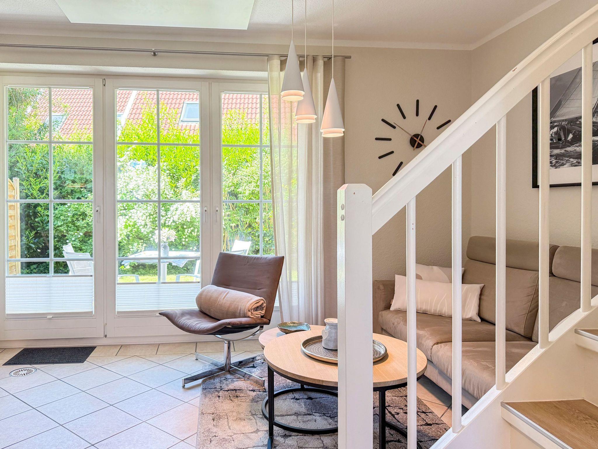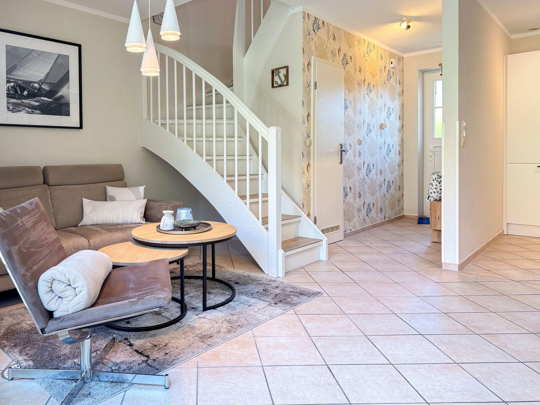 • Wohn- und Essbereich: Gemütlicher Wohnraum im Erdgeschoss mit weichem Sofa, Sessel und großem Esstisch.
