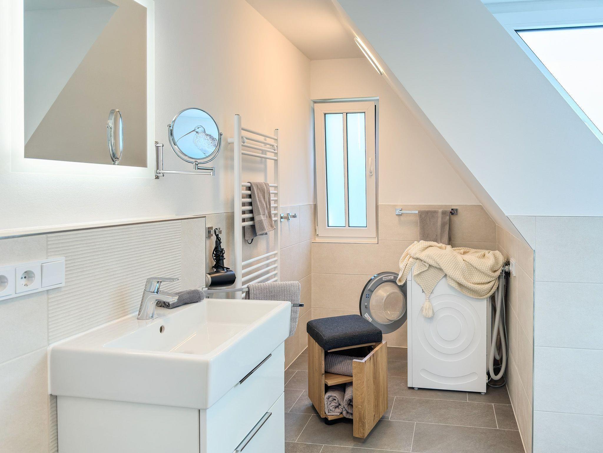 • Modernes Badezimmer mit ebenerdiger Dusche, Fußbodenheizung und Haartrockner
