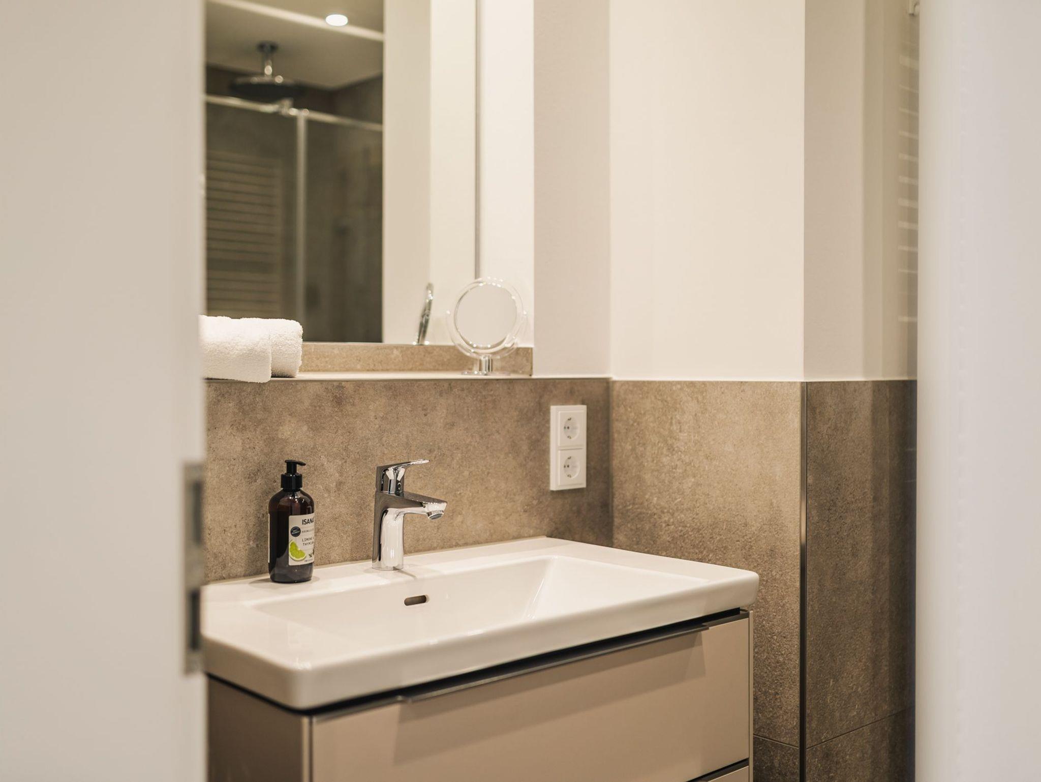 • Modernes Bad mit ebenerdiger Dusche und Zugang zur privaten Sauna