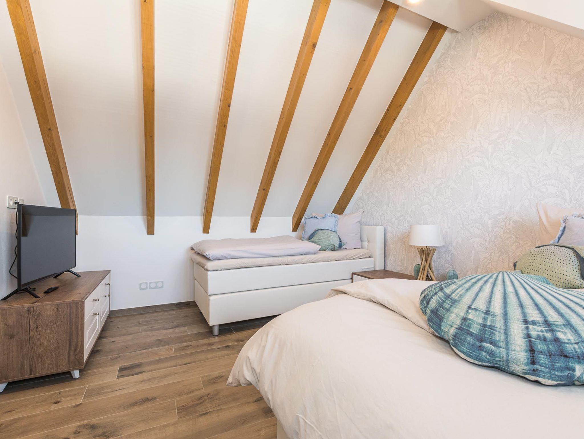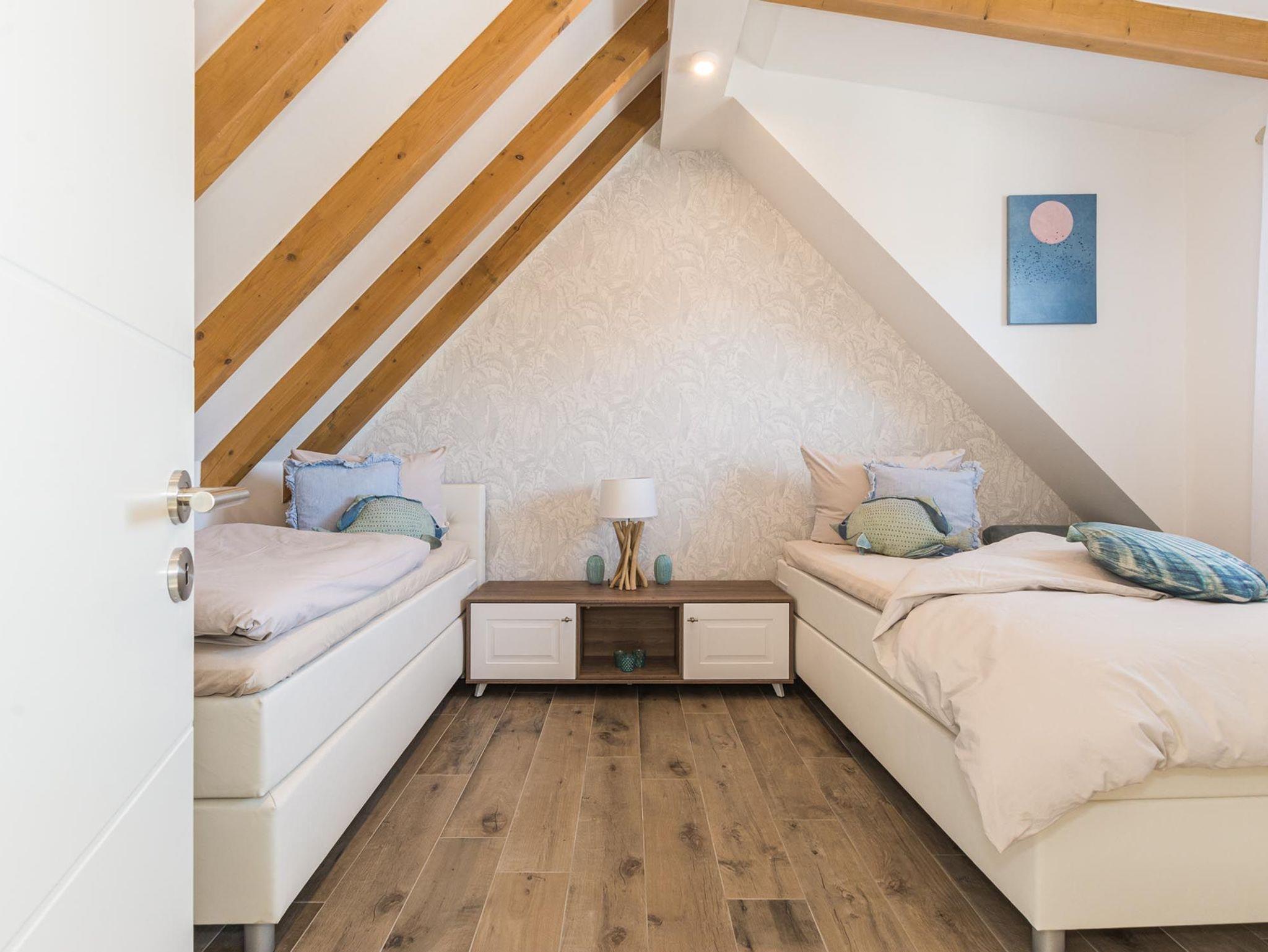 Der offene Wohn-Essbereich ist geräumig und mit hochwertigen Möbeln ausgestattet. Die Küche lässt keine Wünsche offen - Backofen, Mikrowelle, Geschirrspüler u.v.m. Einen gemütlichen TV-Abend genießen Sie auf der modernen Sitzgarnitur. Auf dem nach Süd-West aufgerichteten Balkon genießen Sie die Abendsonne und lassen den Tag ausklingen. Das Schlafzimmer ist mit einem hochwertigen Boxspringbett ausgestattet. In das Dachgeschoss gelangen Sie über eine offene Holztreppe. Hier erwartet Sie ein weiteres Highlight: eine Sauna mit Ruheraum, Dusche und direktem Zugang zur 2. Terrasse. Ebenso auf der Etage ist das 2. Schlafzimmer mit 2 Einzelbetten (Boxspringbetten) und Flatscreen-TV sowie das 2. Bad mit WC.