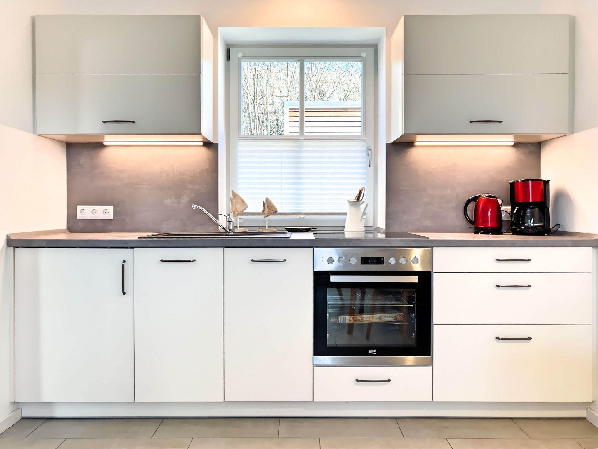 • Voll ausgestattete Küchenzeile: Kochfeld, Backofen, Kühlschrank, Geschirrspüler und Filterkaffeemaschine