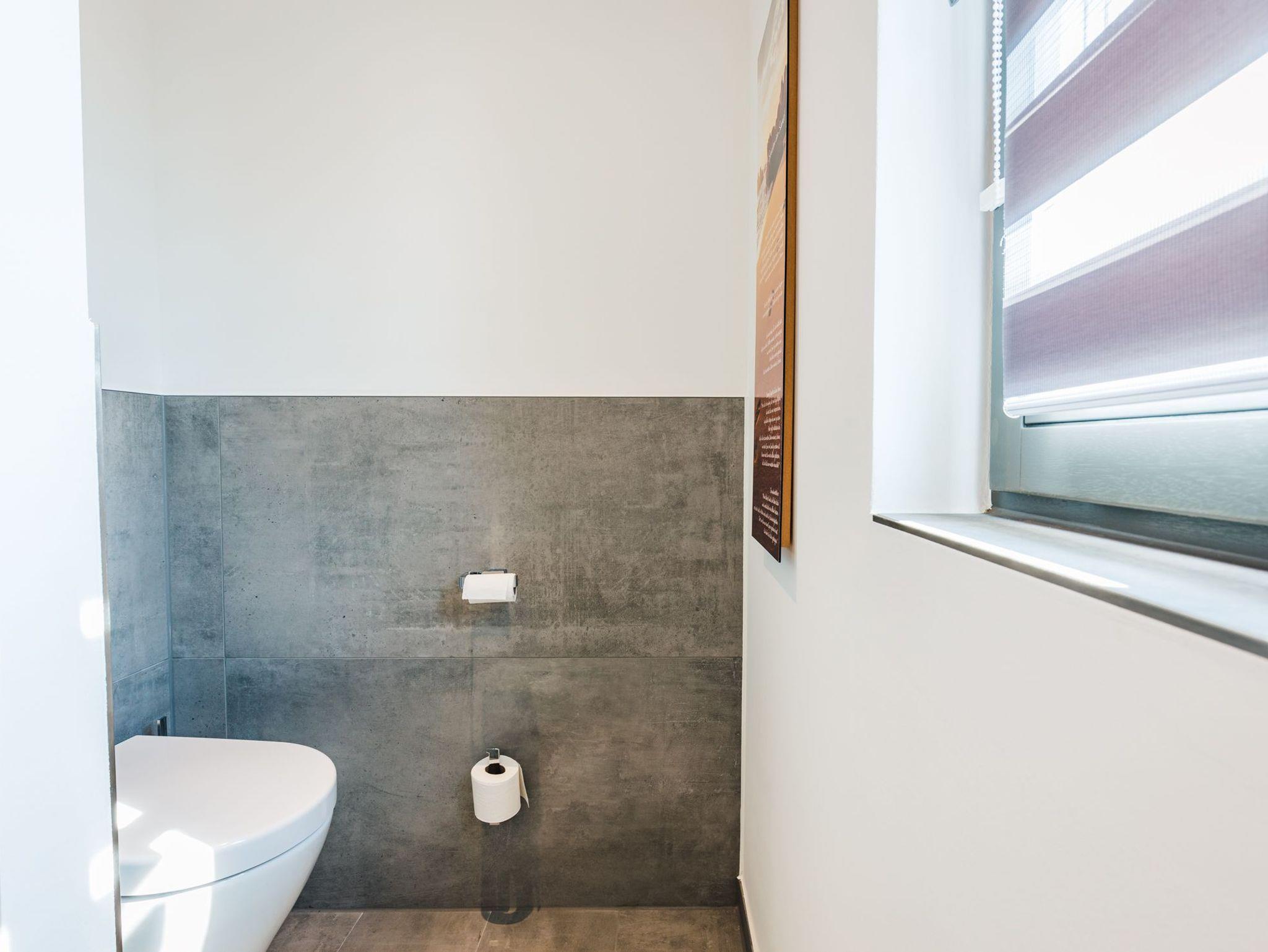 Im großzügigen Bad gibt es großformatige moderne Fliesen sowie eine Doppelwaschtisch mit Panoramaspiegel. In der Dusche kann man zusätzlich die Regenschauerpipe genießen.