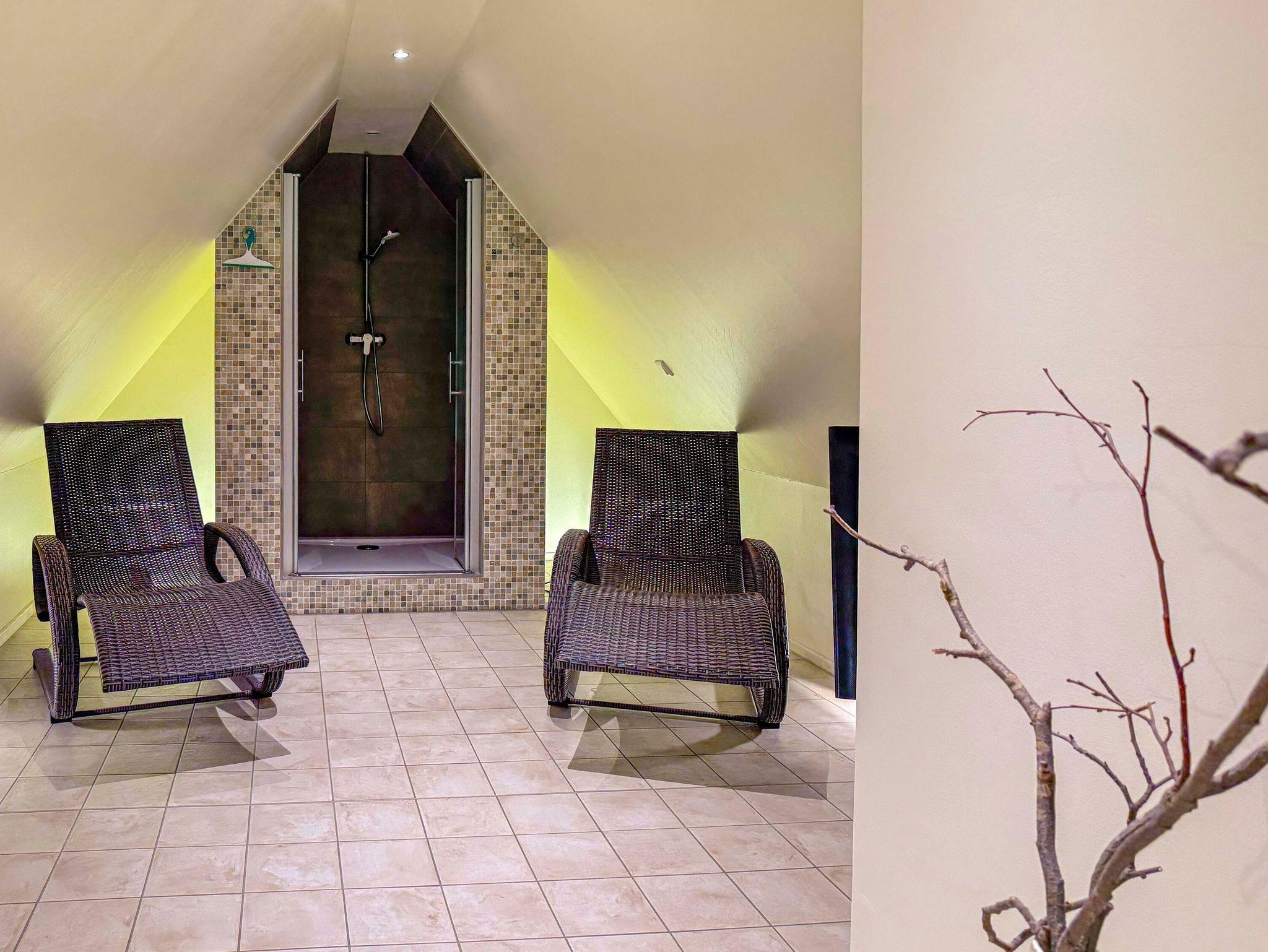 Im gemeinschaftlichen Wellnessbereich erwartet Sie eine moderne Sauna, in der Sie nach einem Tag an der frischen Meeresluft neue Energie tanken können (Nutzung für 2?€ pro Gang). Eine Fußbodenheizung sorgt auch an kühlen Tagen für behagliche Wärme. Auf der Terrasse genießen Sie das Frühstück in der Morgensonne oder lassen bei einem Glas Wein den Abend ausklingen, während Kinder auf der Liegewiese spielen können.