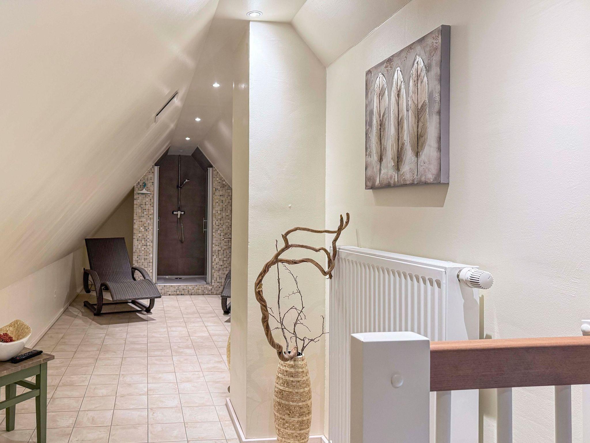 Im gemeinschaftlichen Wellnessbereich erwartet Sie eine moderne Sauna, in der Sie nach einem Tag an der frischen Meeresluft neue Energie tanken können (Nutzung für 2? pro Gang). Eine Fußbodenheizung sorgt auch an kühlen Tagen für behagliche Wärme. Auf der Terrasse genießen Sie das Frühstück in der Morgensonne oder lassen bei einem Glas Wein den Abend ausklingen, während Kinder auf der Liegewiese spielen können.