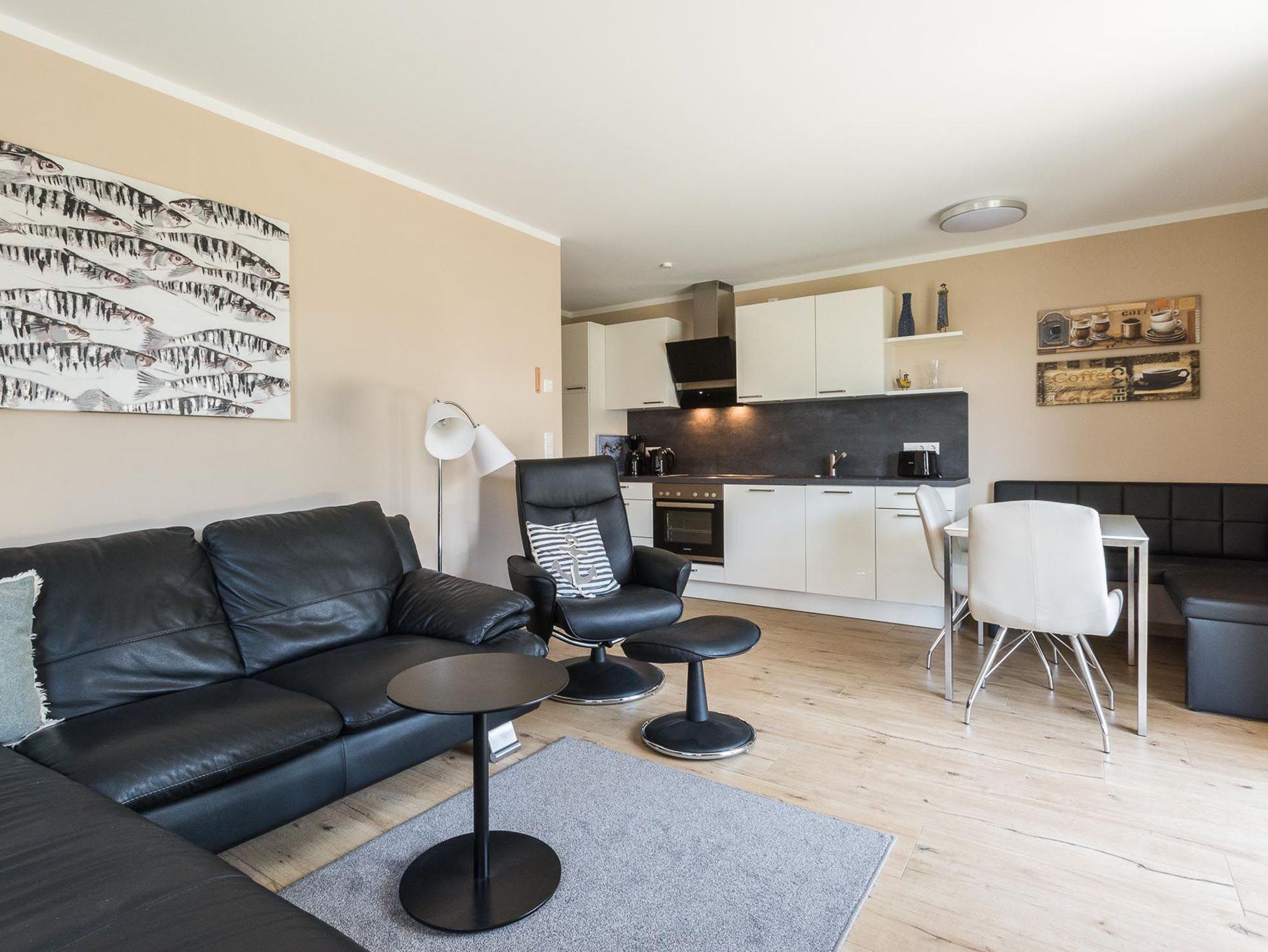 Das Appartement verfügt über einen lichtdurchfluteten Wohnbereich mit einer offenen Küche und gemütlichem Essbereich. Die Küche ist voll ausgestattet.