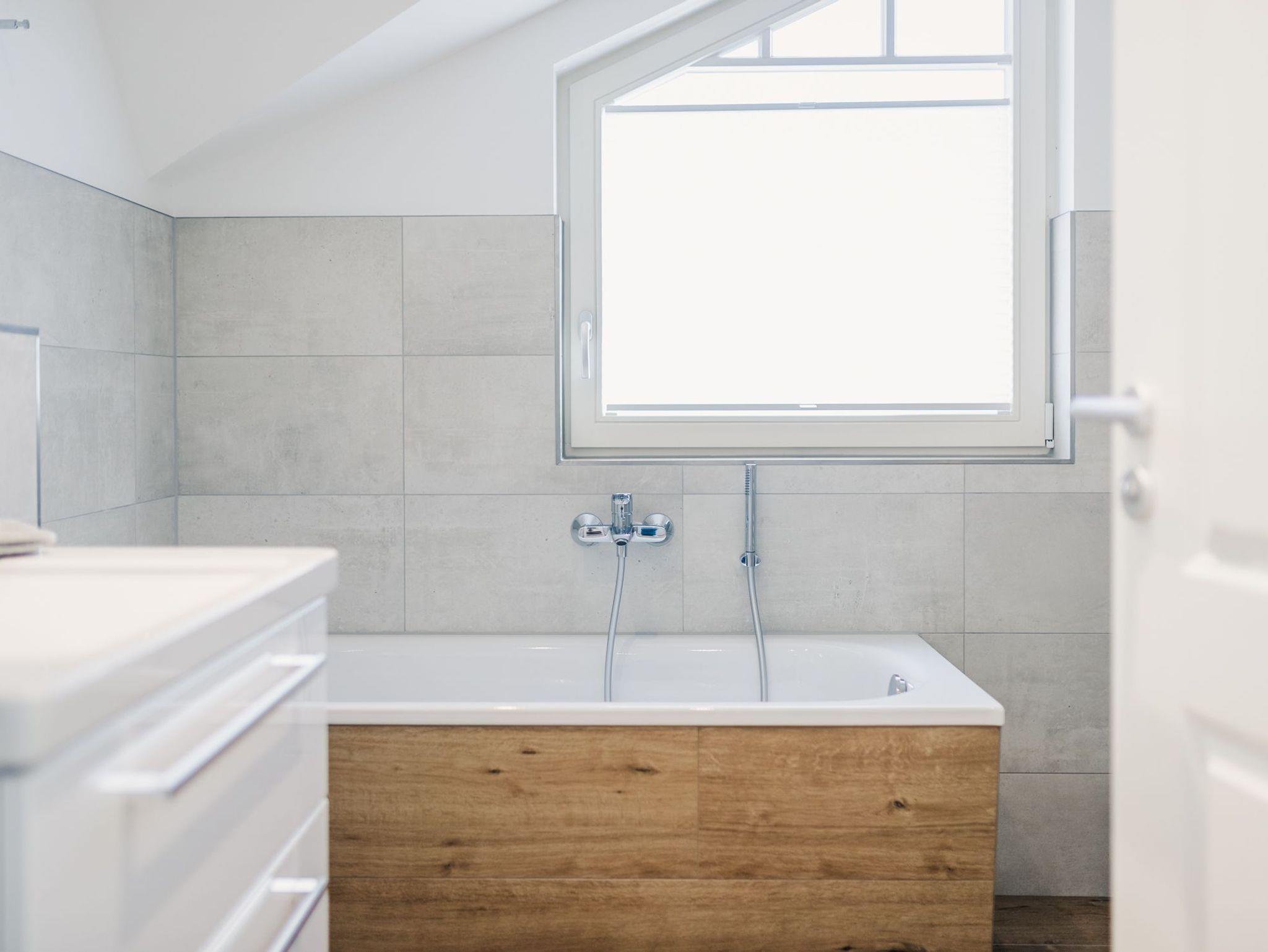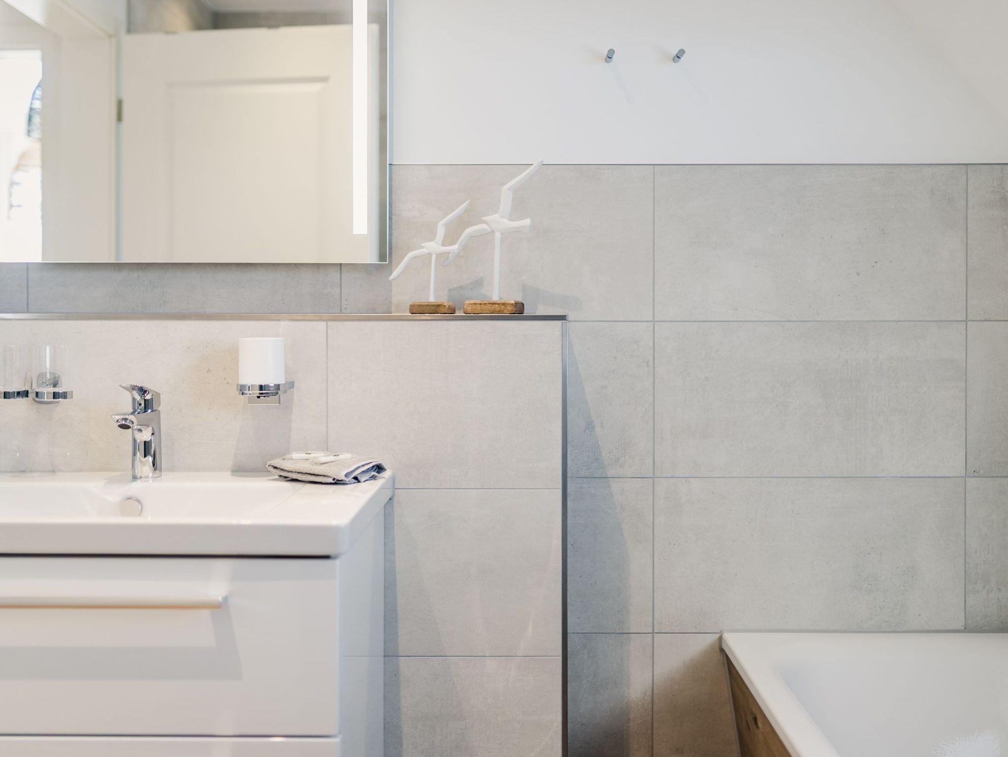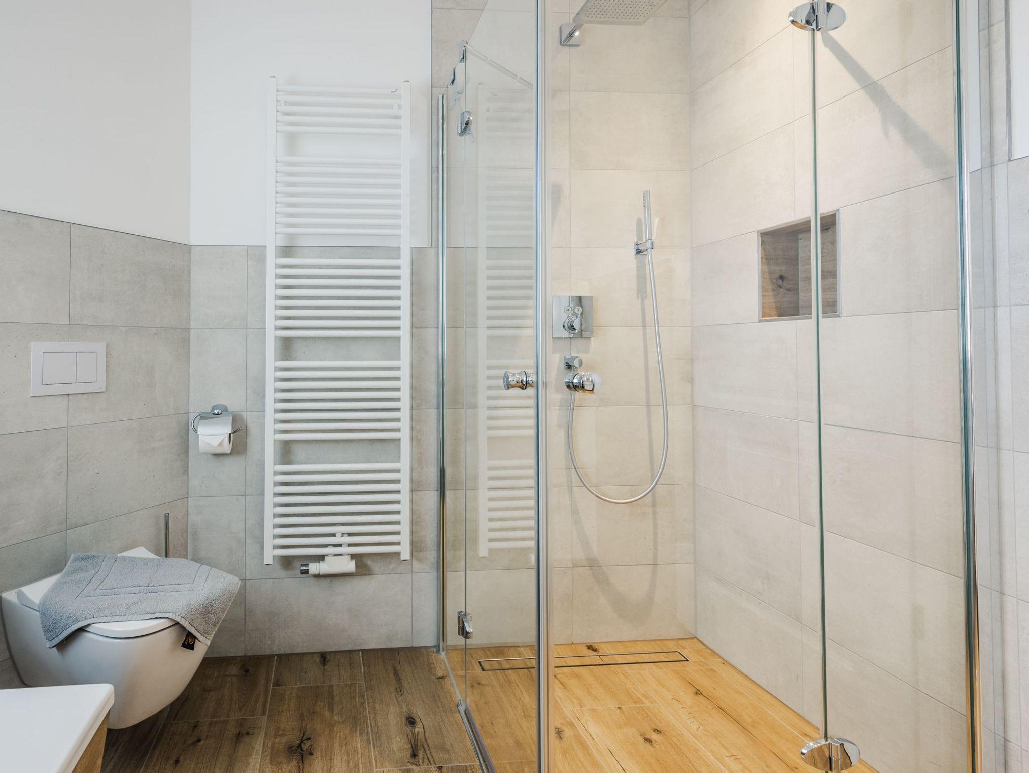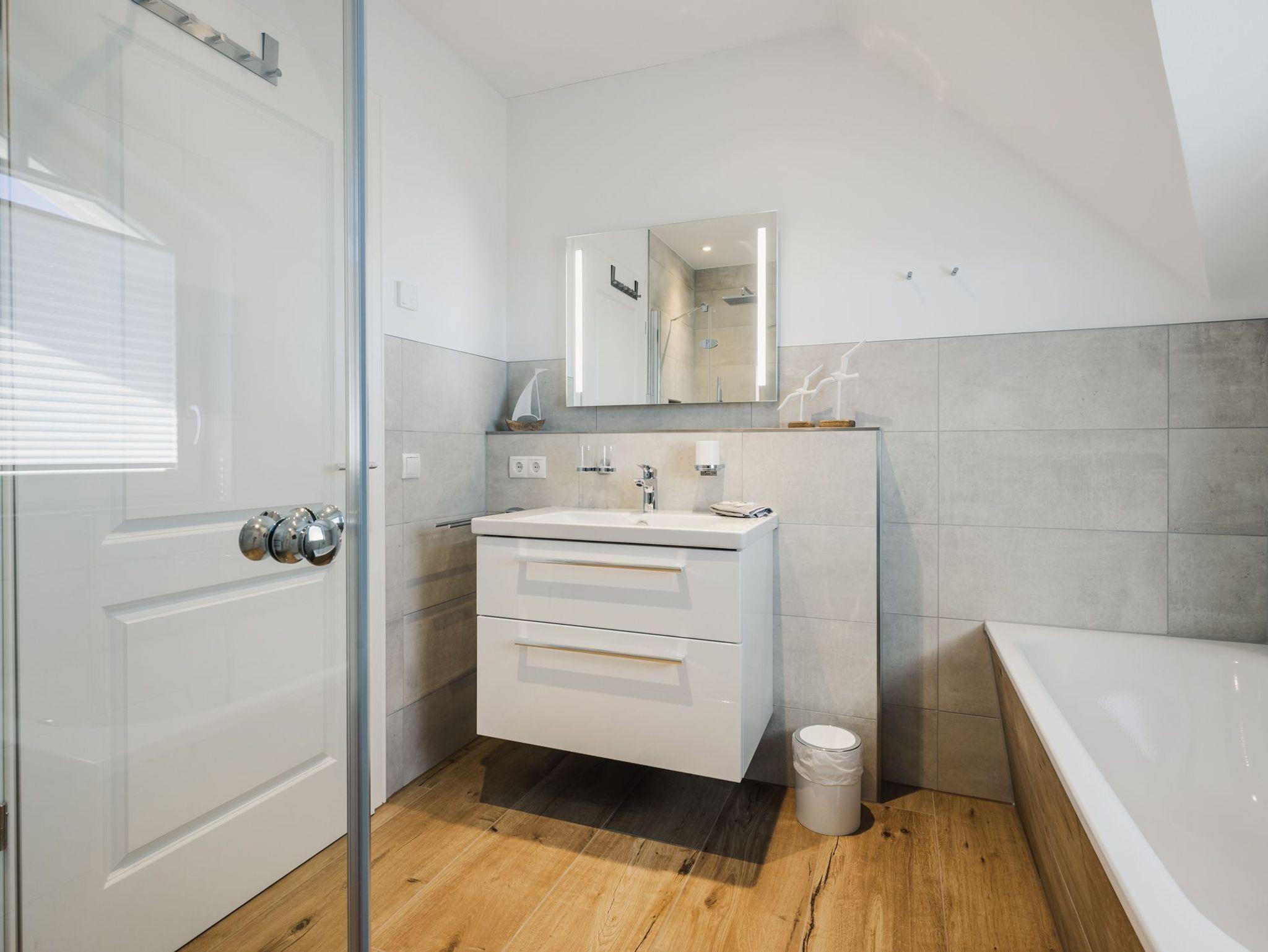 Das Badezimmer mit Tageslicht verfügt über eine Badewanne und eine hochwertige, bodentiefe Dusche mit Regenwald-Funktion, sodass Sie in Ihrem Urlaub entspannen können. Wie in der gesamten Wohnung genießen Sie auch hier den Komfort der Fußbodenheizung.