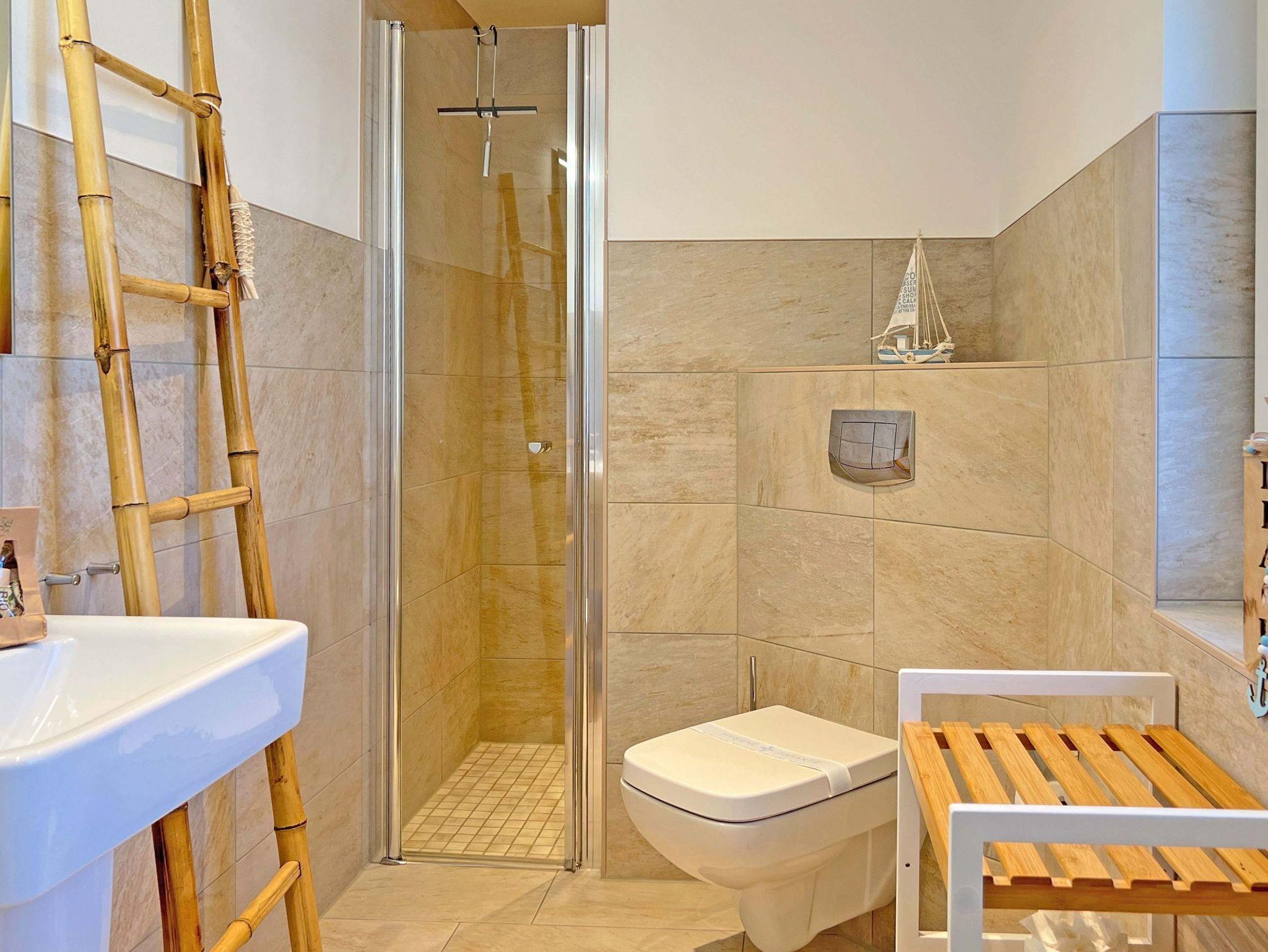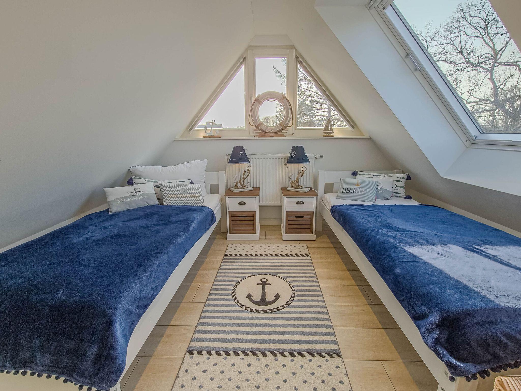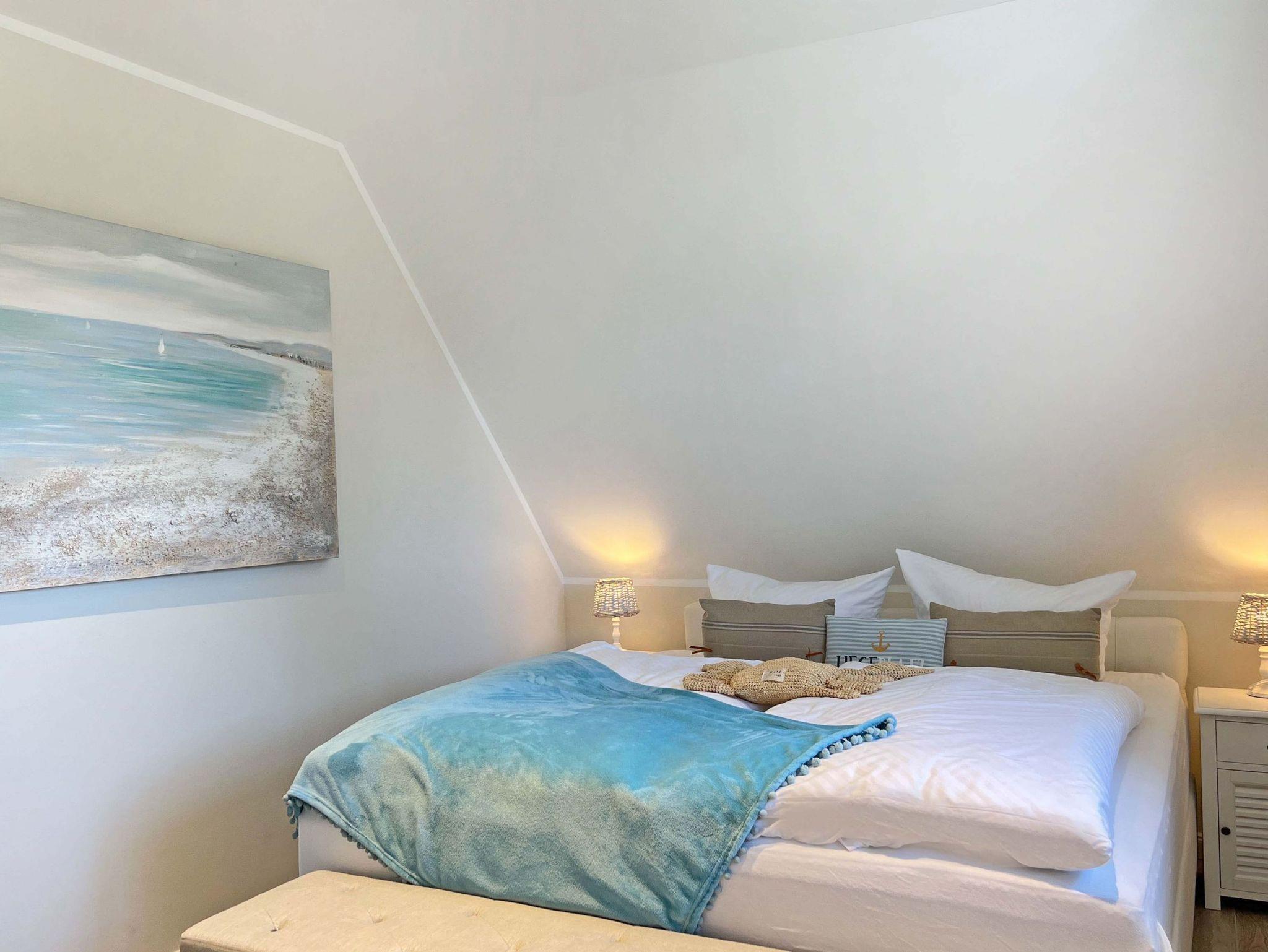 Im Obergeschoss finden Sie drei liebevoll eingerichtete Schlafzimmer, die mit Boxspringbetten und Fliegengittern ausgestattet sind. Verdunklungsmöglichkeiten sorgen für erholsamen Schlaf, während moderne Badezimmer mit Fußbodenheizung und ebenerdiger Dusche Komfort bieten.