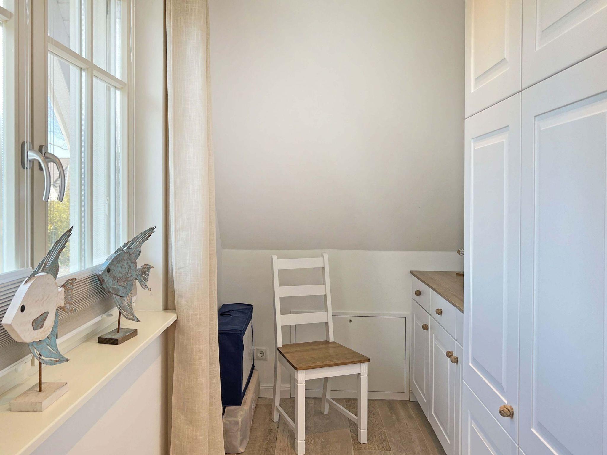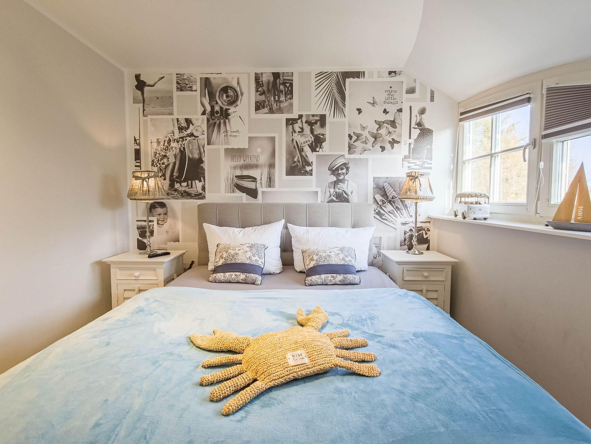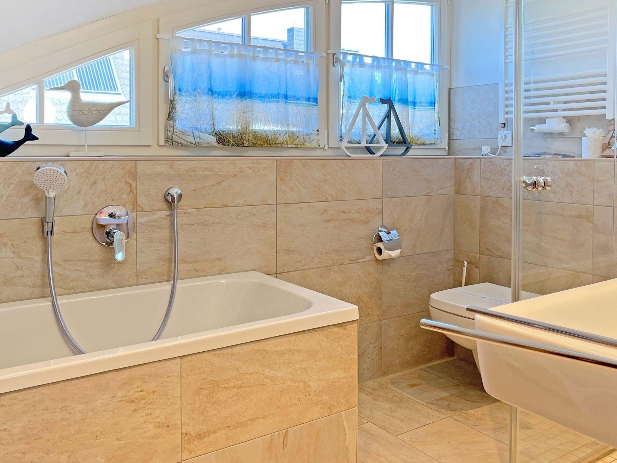 Im Obergeschoss finden Sie drei liebevoll eingerichtete Schlafzimmer, die mit Boxspringbetten und Fliegengittern ausgestattet sind. Verdunklungsmöglichkeiten sorgen für erholsamen Schlaf, während moderne Badezimmer mit Fußbodenheizung und ebenerdiger Dusche Komfort bieten.