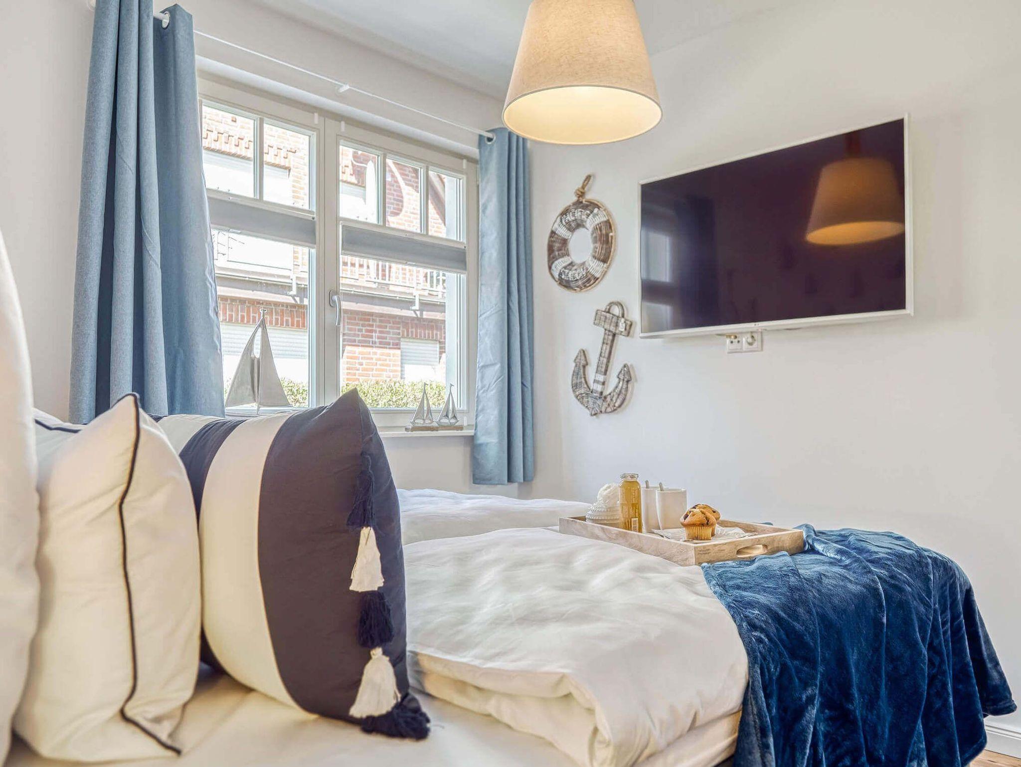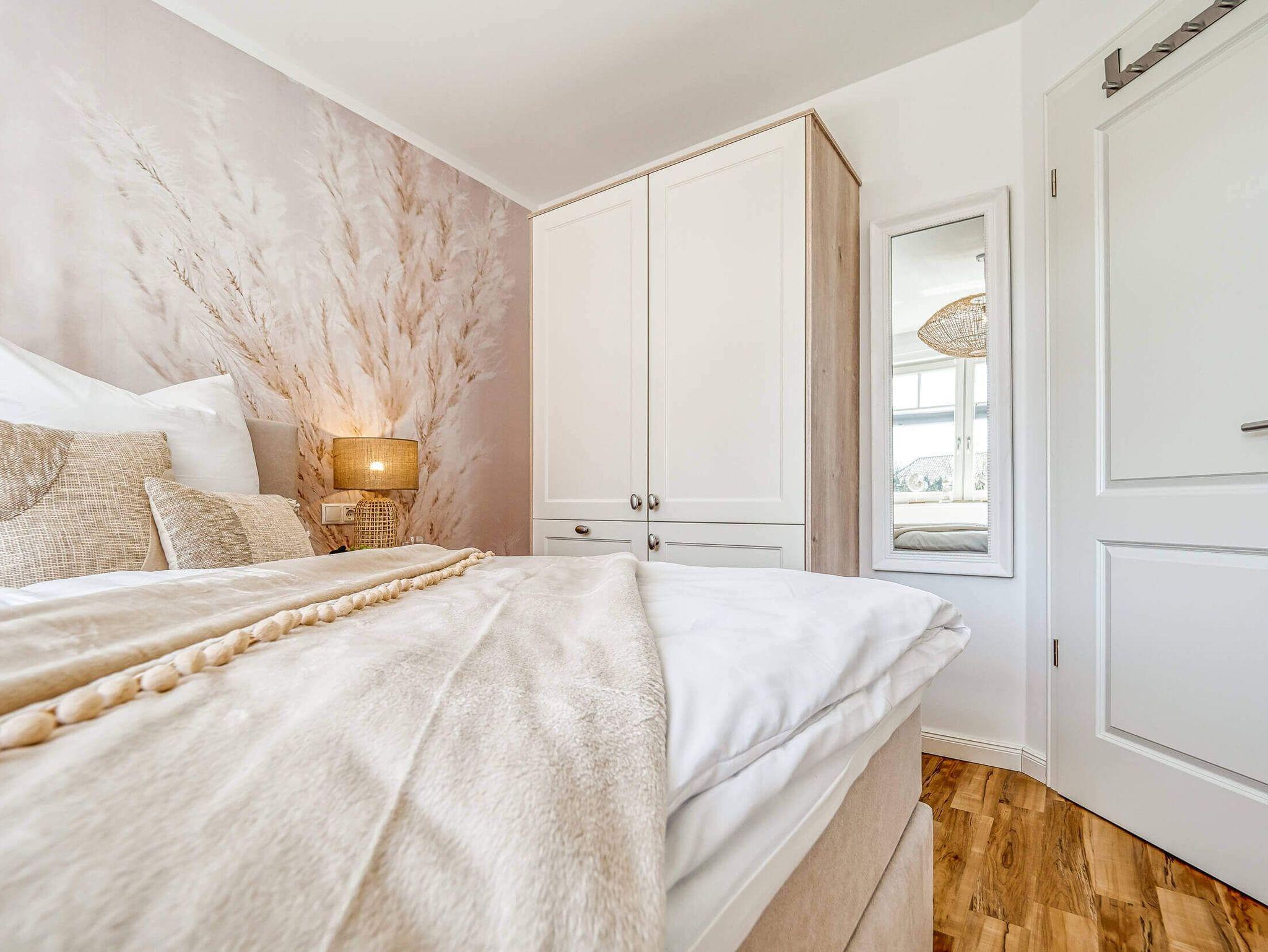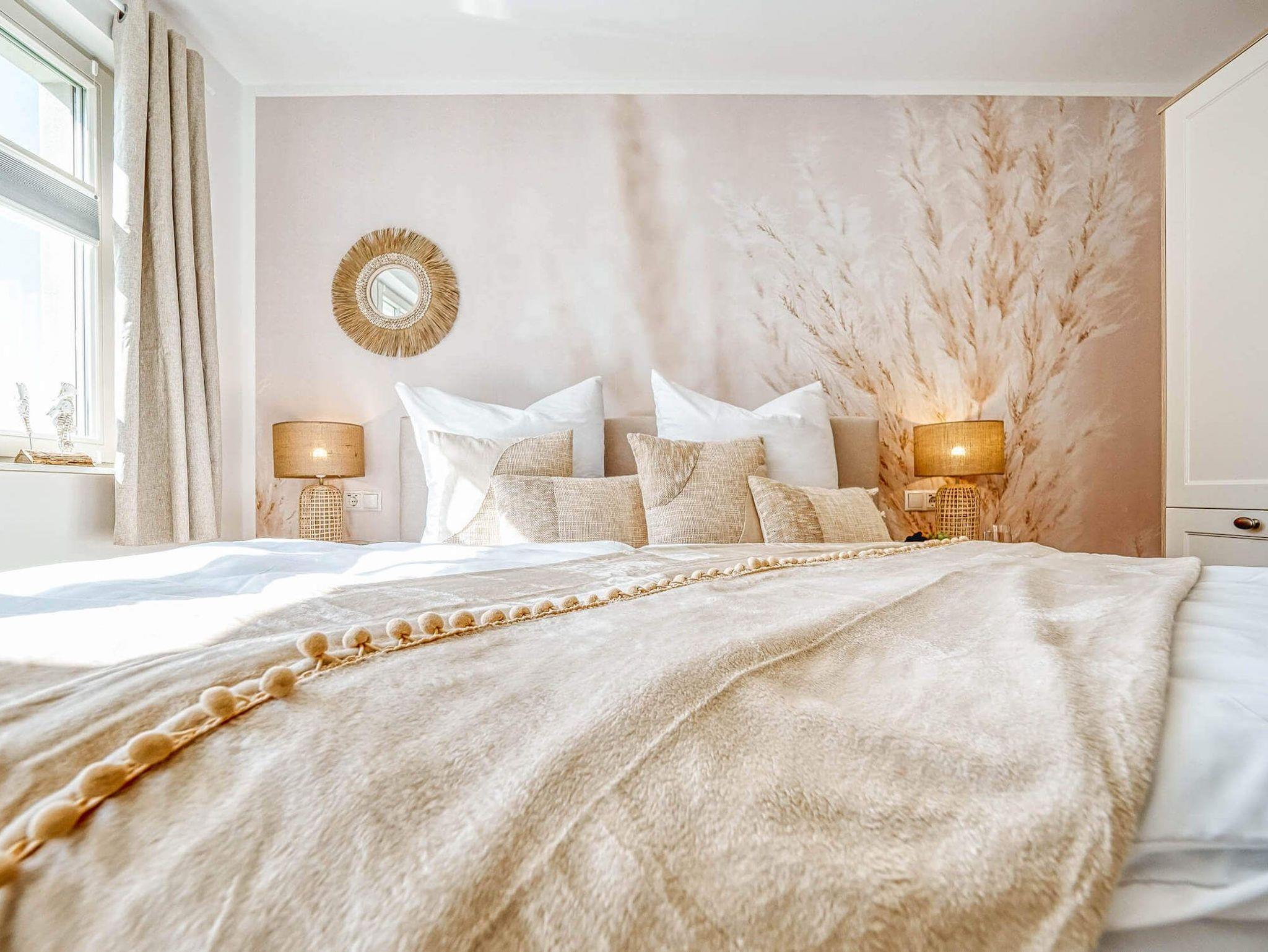 Die Wohnung bietet zwei Schlafräume, beide Schlafräume sind jeweils mit hochwertigen Bockspringbetten (180 x 200 cm) und Kleiderschrank, sowie Smart TV`s ausgestattet. In dem großzügigen Badezimmer befindet sich eine hochwertige, bodentiefe Dusche, sowie ein Doppelwaschtisch mit WC und Waschtrockner. Ein Baby- und Kleinkindreisebett, sowie ein Hochstuhl steht Ihnen bei Bedarf ebenfalls kostenfrei zur Verfügung.
