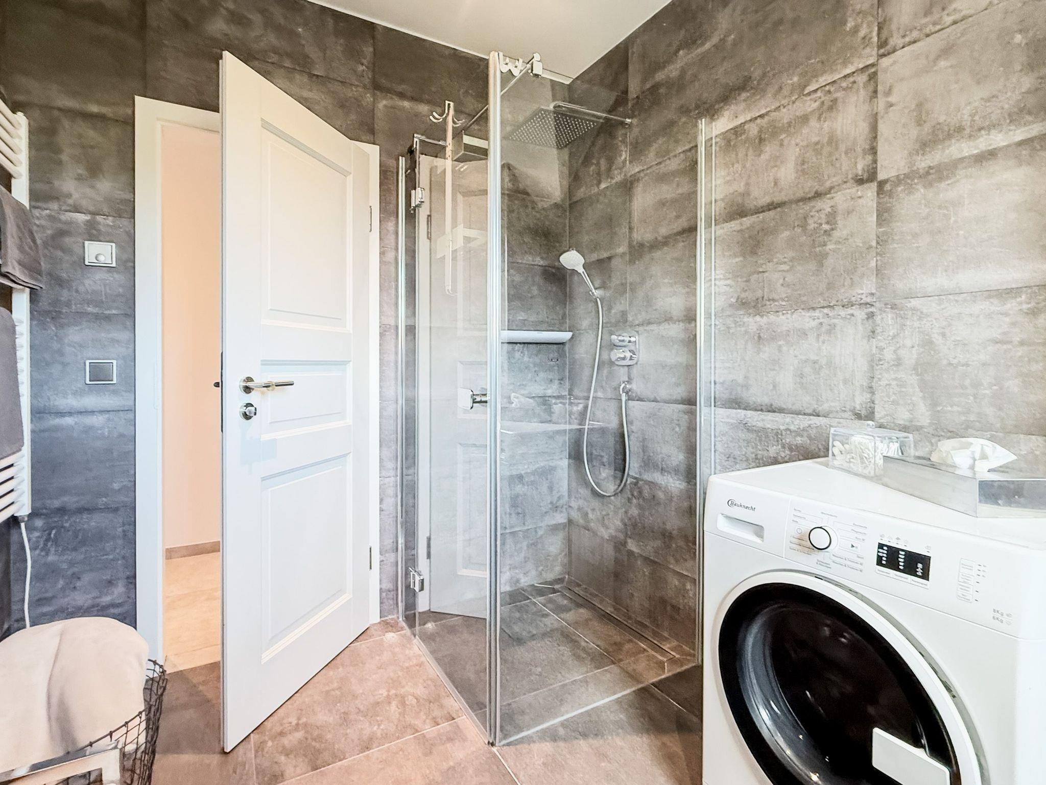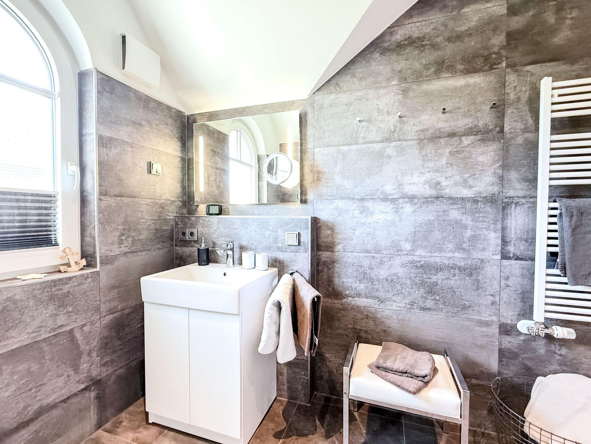 • Badezimmer: Modernes Bad mit ebenerdiger Dusche, Handtuchtrockner, Föhn und Fußbodenheizung