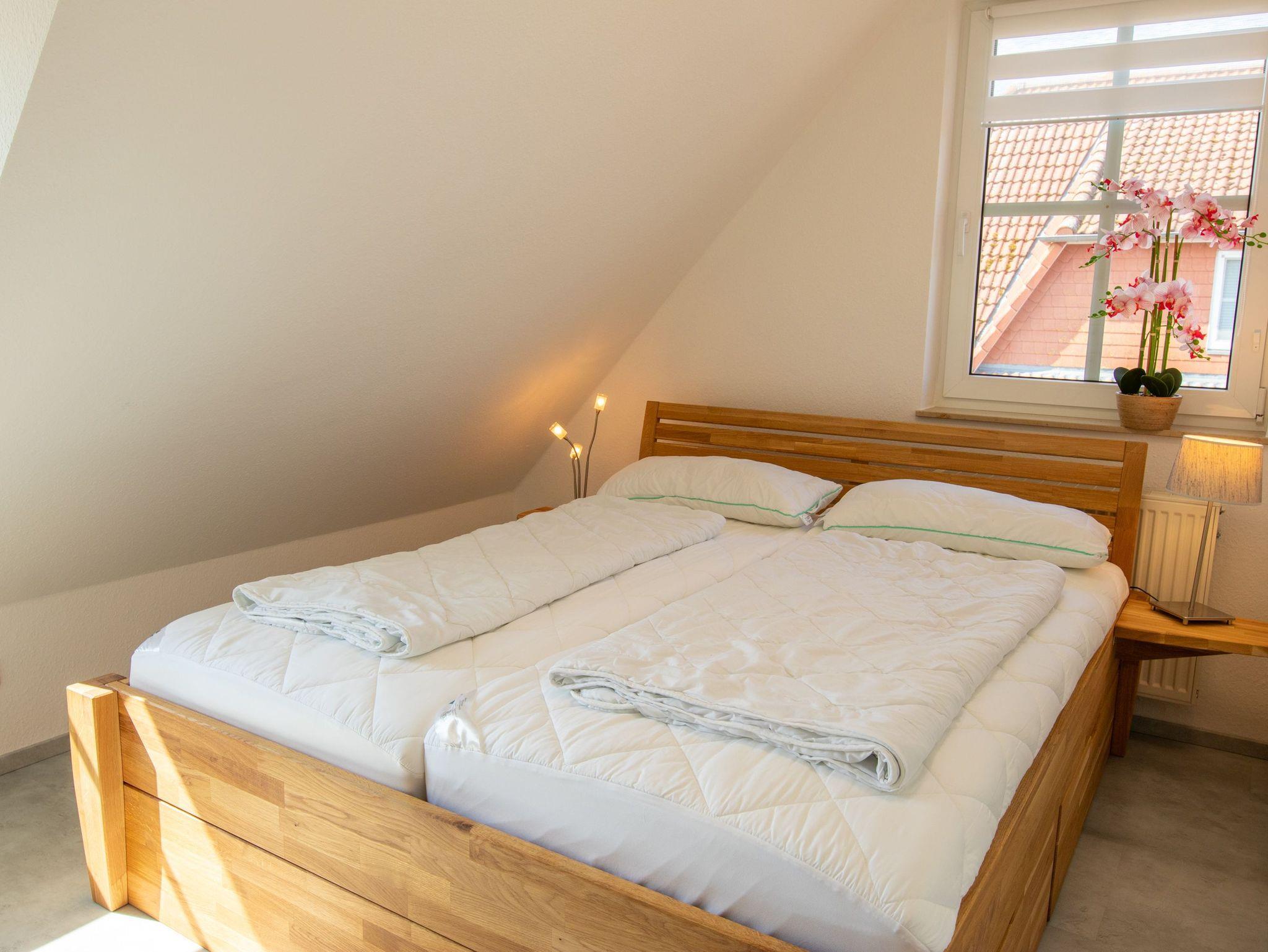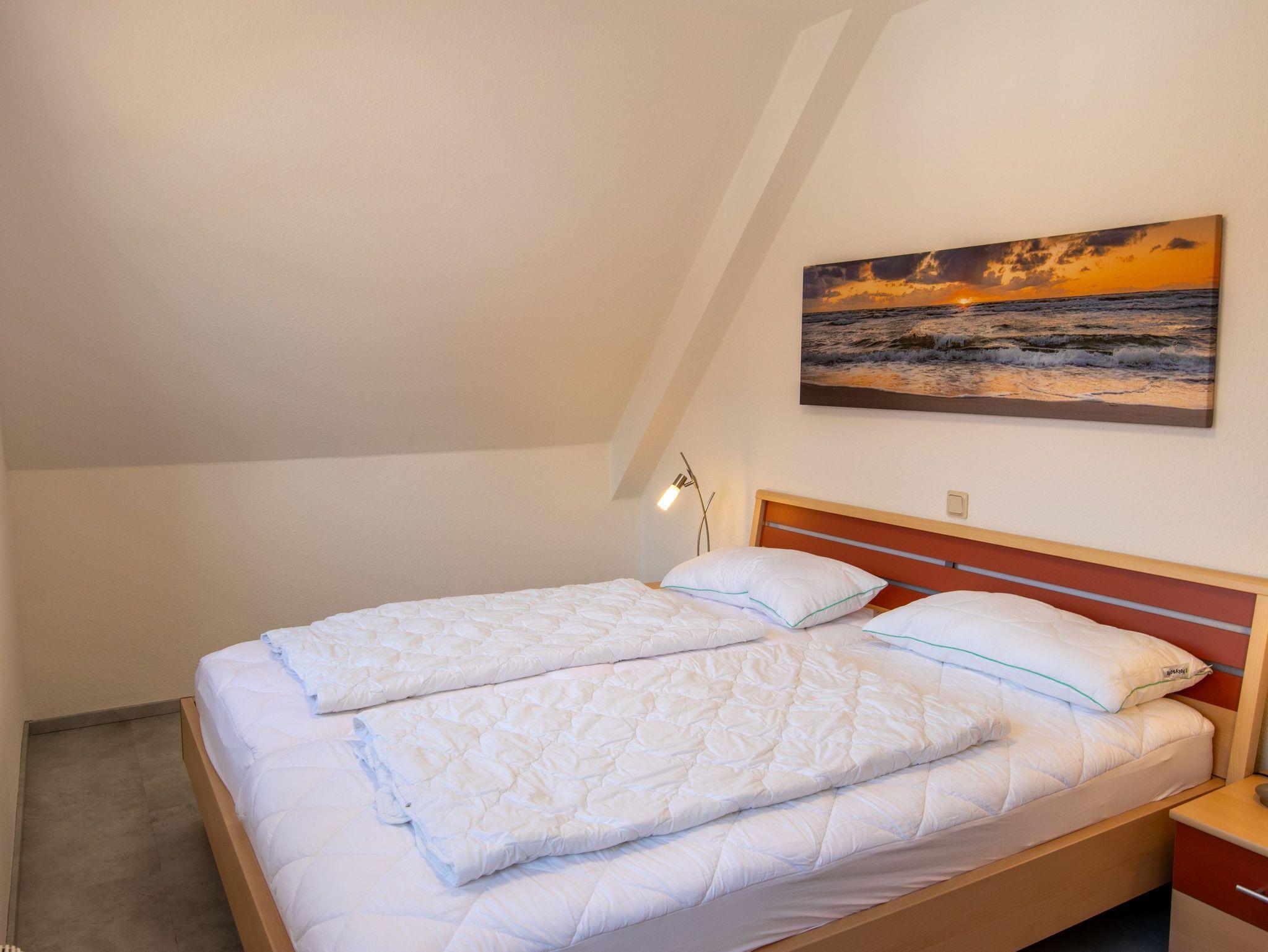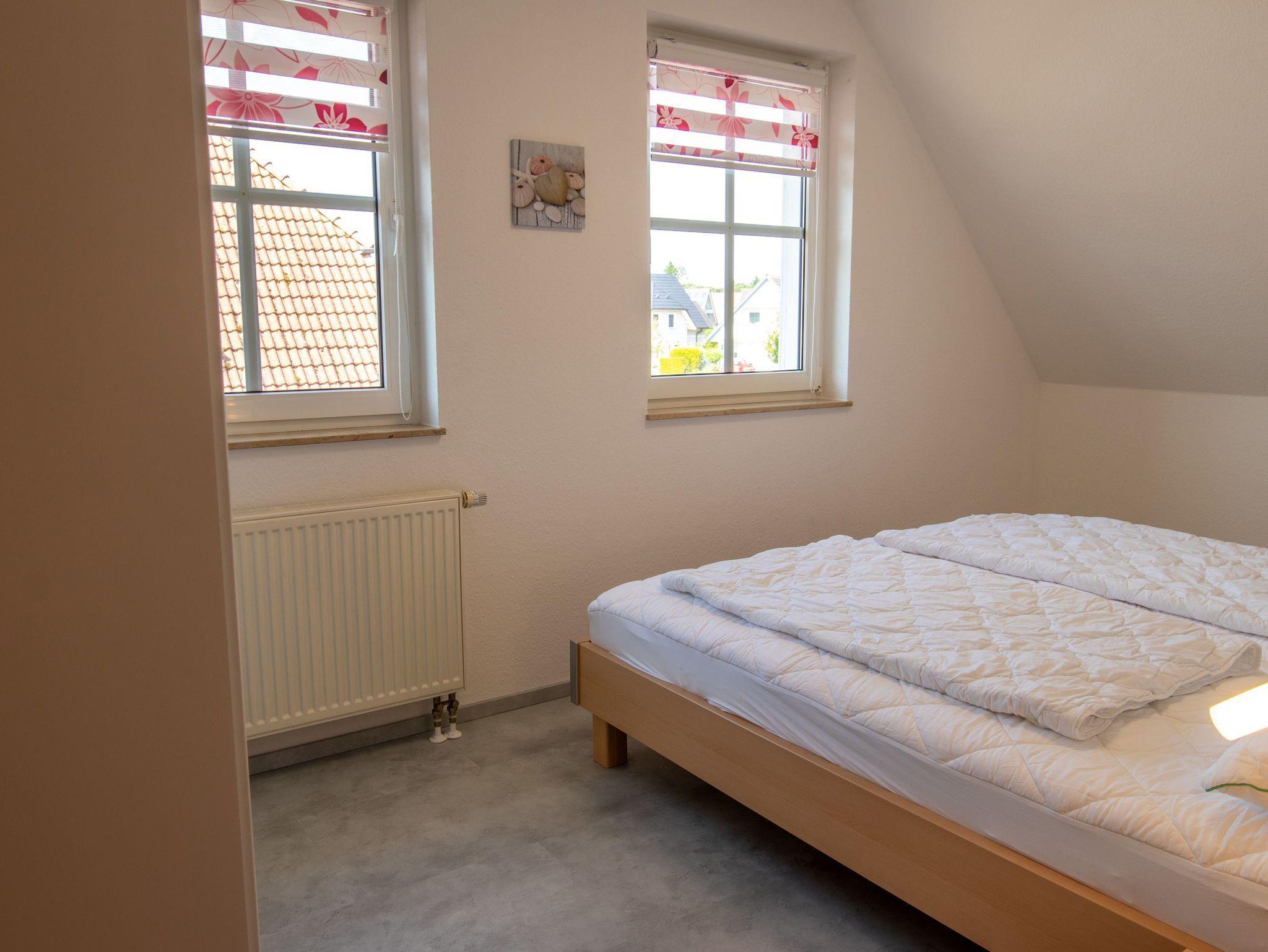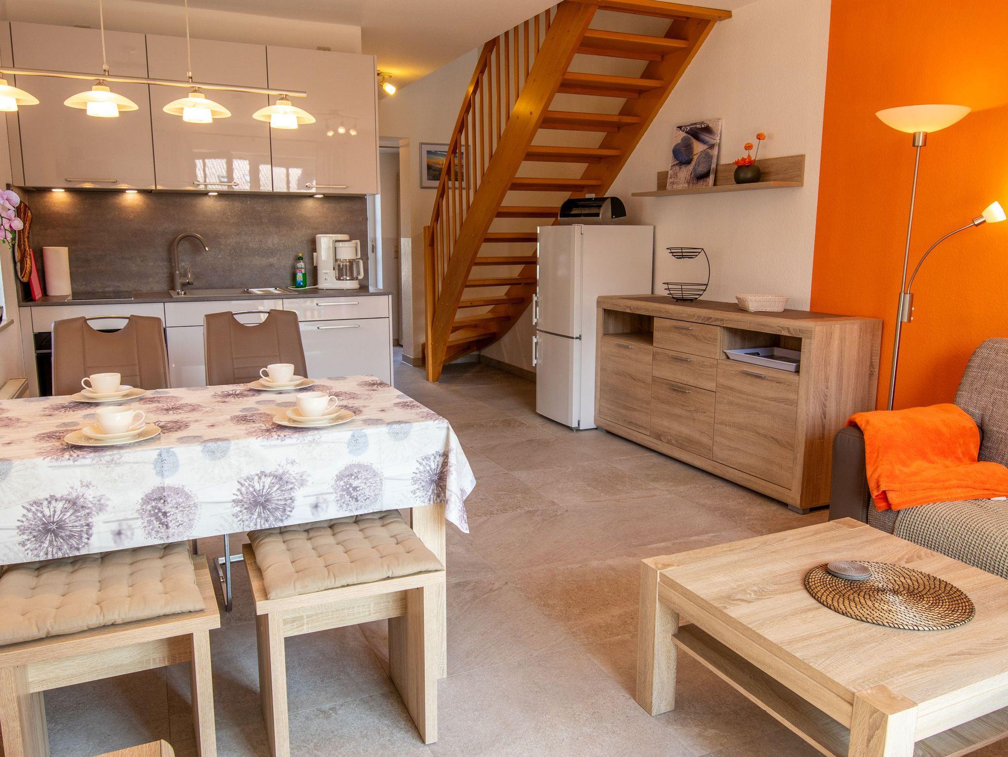Die Ferienwohnung besticht mit ihrem maritimen Charakter und den 2 Etagen für 4 Personen. Im Erdgeschoss befinden sich das Wohnzimmer und das Bad mit WC und ebenerdiger Dusche. Die offen gestaltete Küche ist mit einem Backofen, Herd, Spülmaschine, Kühlschrank und Kochutensilien des täglichen Bedarf ausgestattet. Als Essbereich eignet sich sowohl der Esstisch im Wohnzimmer, als auch die Sitzmöglichkeiten auf der angrenzenden Terrasse. Dort gibt es des Weiteren die Möglichkeit den Grill für entspannte BBQ Abende zu nutzen. Die beiden separaten Schlafzimmer befinden sich im Obergeschoss des Hauses und sind jeweils mit einem Doppelbett (180x200) und einem Kleiderschrank oder einer Kommode ausgestattet.