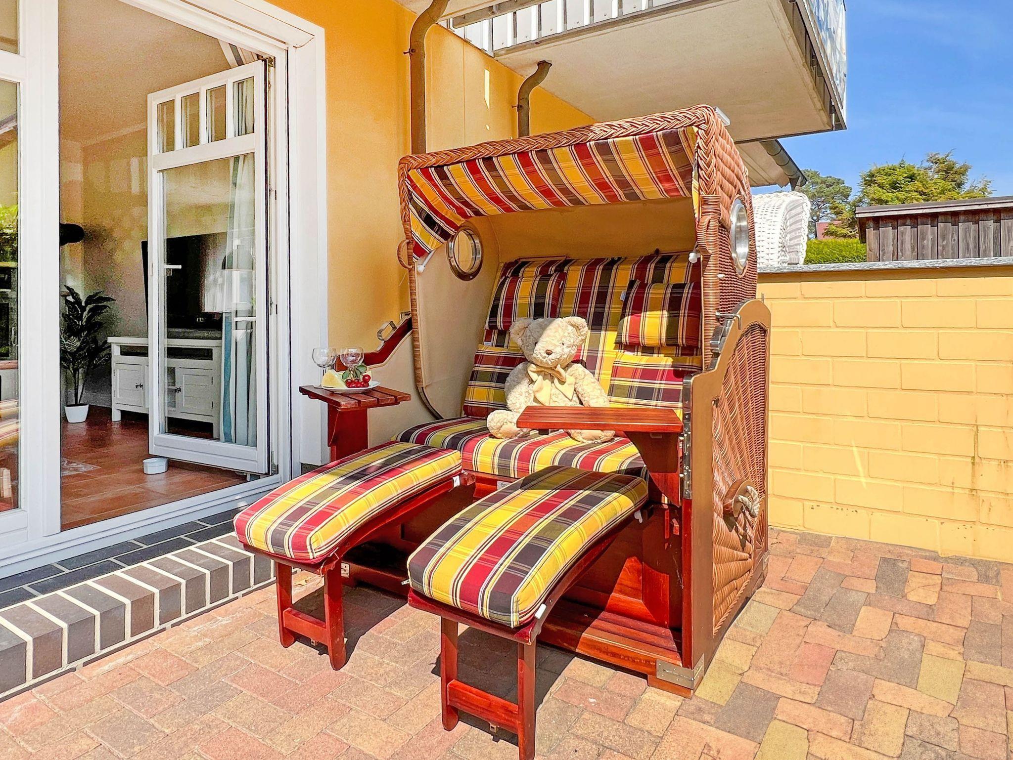 • Sonnige Terrasse mit Strandkorb und Gartenmöbeln