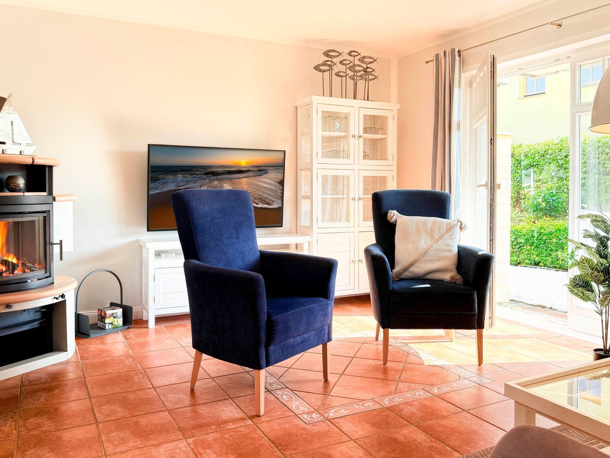 • Gemütlicher Wohnbereich mit Kamin und Blick in den Garten