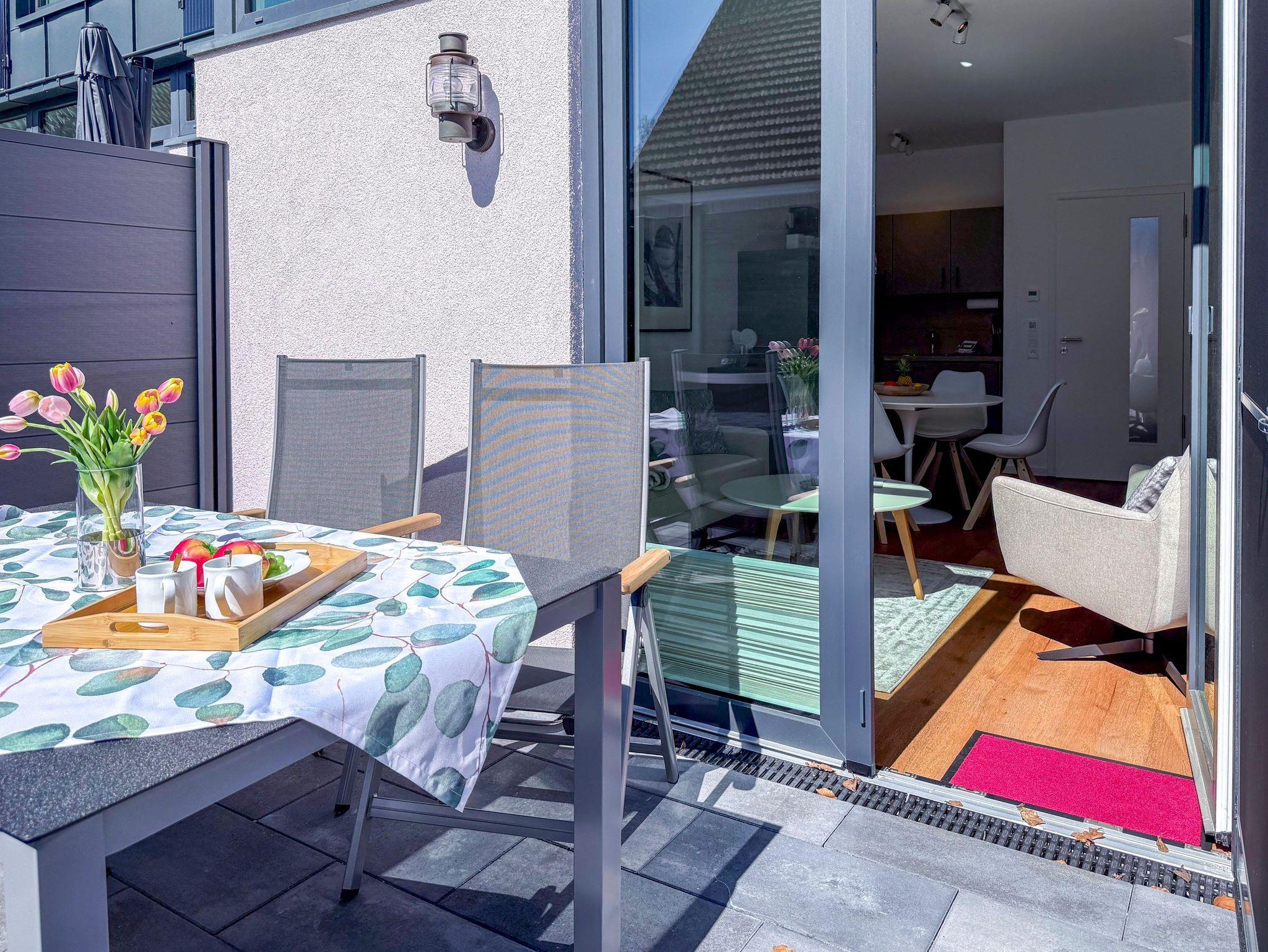 • Private Terrasse mit Gartenmöbeln und Sonnenschirm perfekt für entspannte Stunden im Freien