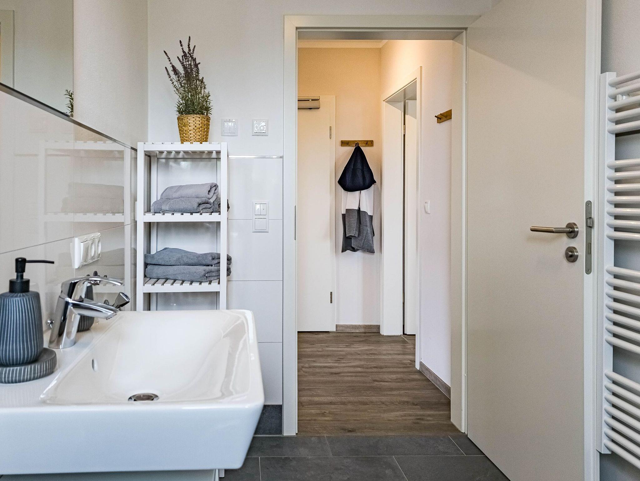 • Badezimmer: Modernes Bad mit bodentiefer Dusche, WC, Haartrockner und Fußbodenheizung für zusätzlichen Komfort.