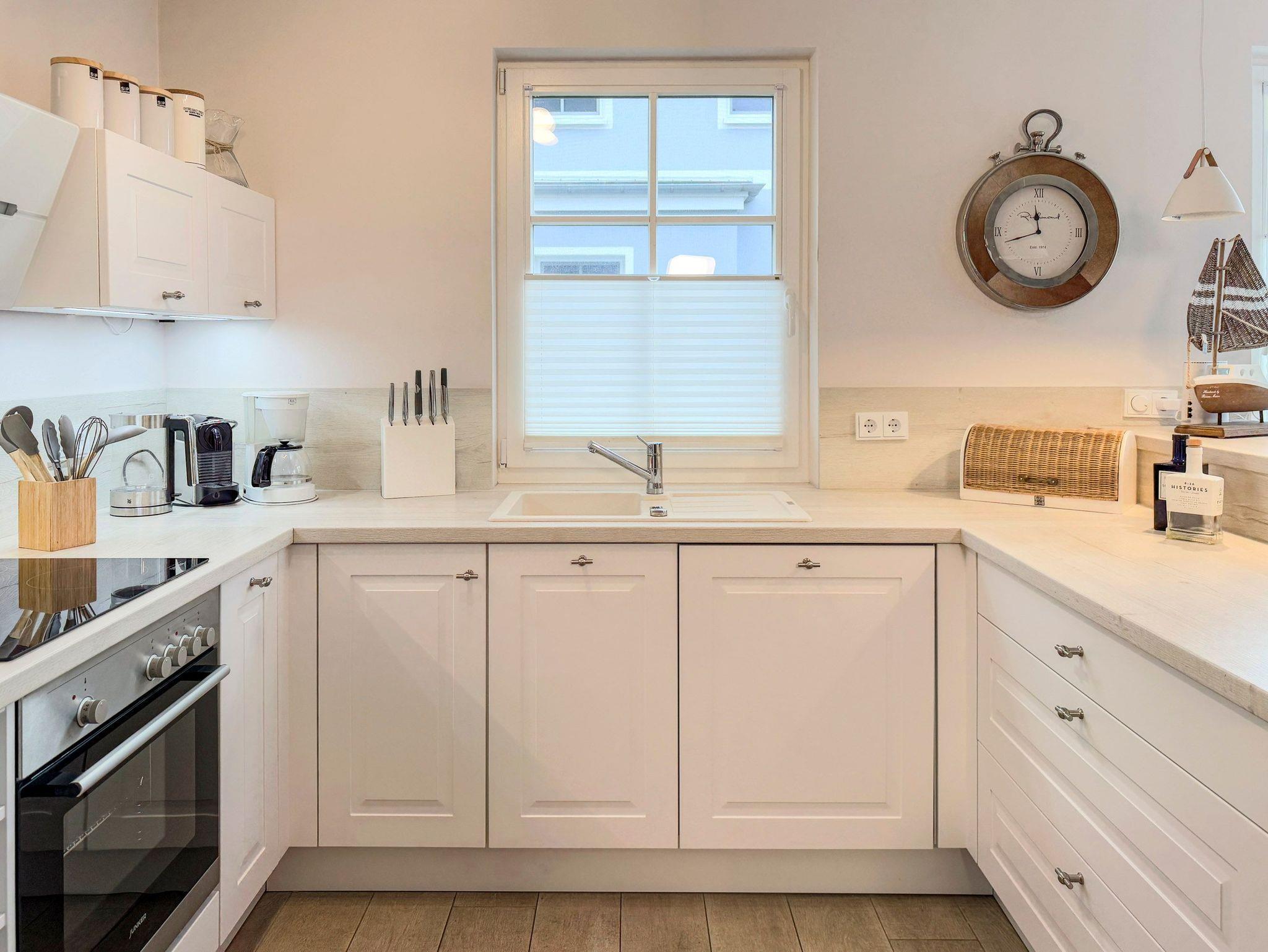 • Moderne Küche ausgestattet mit Geschirrspüler, Kaffeevollautomat, Backofen und Mikrowelle