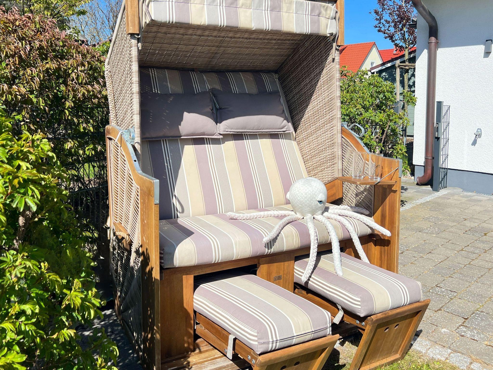Die große Süd-West-Terrasse mit modernen Gartenmöbeln, Sonnenschirm und einem Weber-Holzkohle-Grill lädt zum Verweilen ein. Im eingezäunten Garten stehen Ihnen ein Strandkorb und 4 Sonnenliegen zur Verfügung ideal für entspannte Tage in der Sonne.