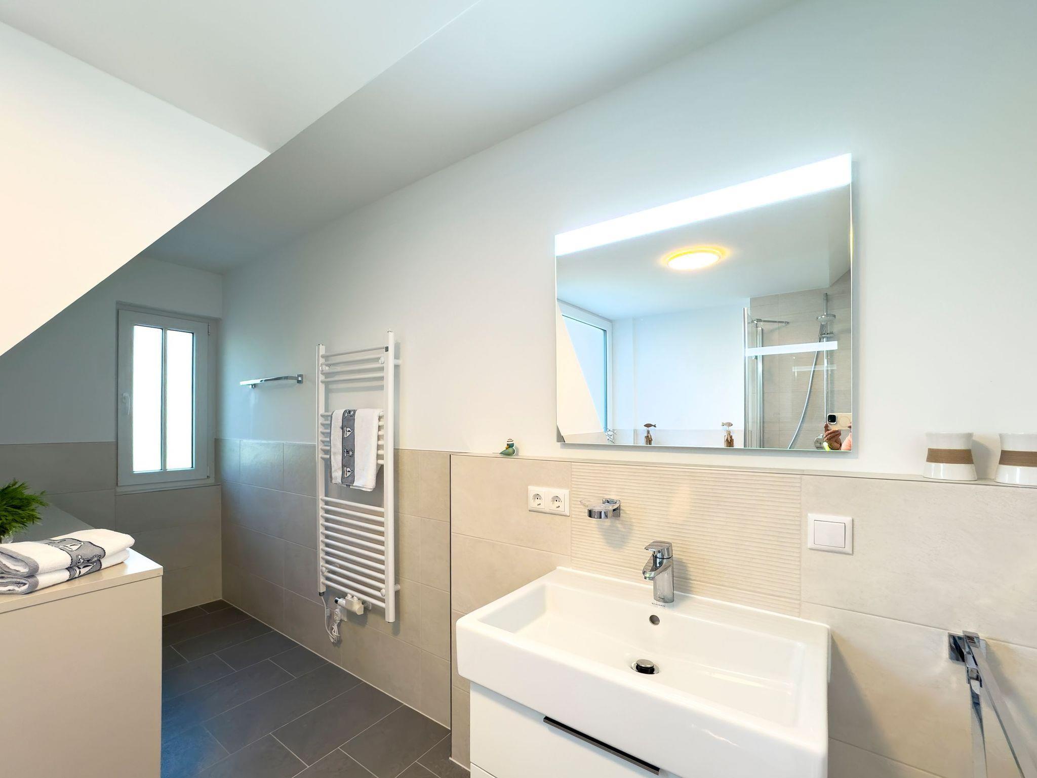 • Badezimmer mit ebenerdiger Dusche und Fußbodenheizung