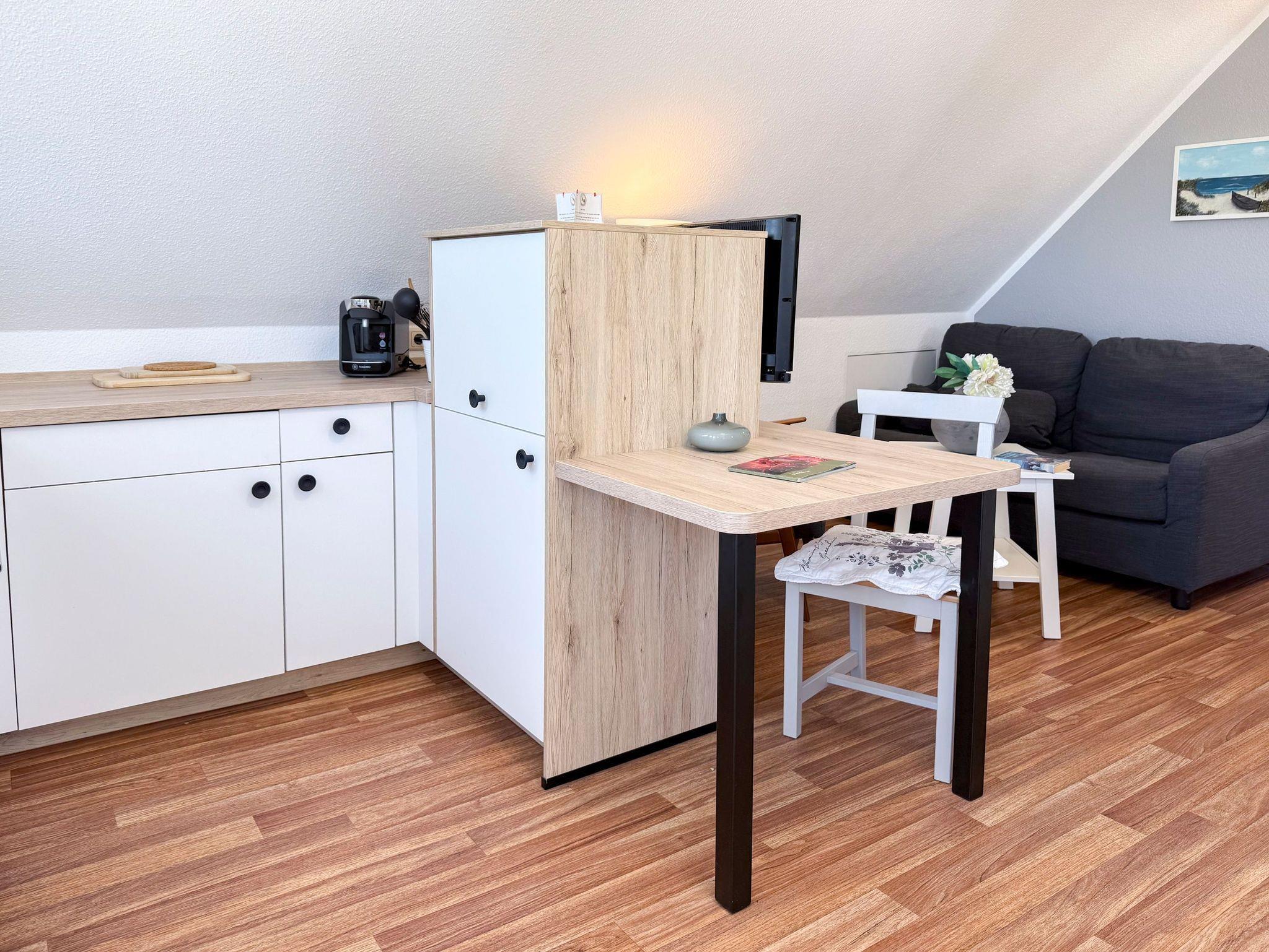 Die Ferienwohnung Velo 3[nbsp]empfängt Sie mit einer hellen und freundlichen Atmosphäre. Der offene Wohn- und Essbereich lädt zum Wohlfühlen ein ob beim gemeinsamen Frühstück, entspannten Fernsehabenden oder einfach zum Relaxen. Die kompakte Küchenzeile ist bestens ausgestattet, um auch im Urlaub unkompliziert leckere Mahlzeiten zuzubereiten. Auf dem Balkon lässt sich der Tag perfekt mit einem Kaffee am Morgen oder einem Glas Wein am Abend genießen.