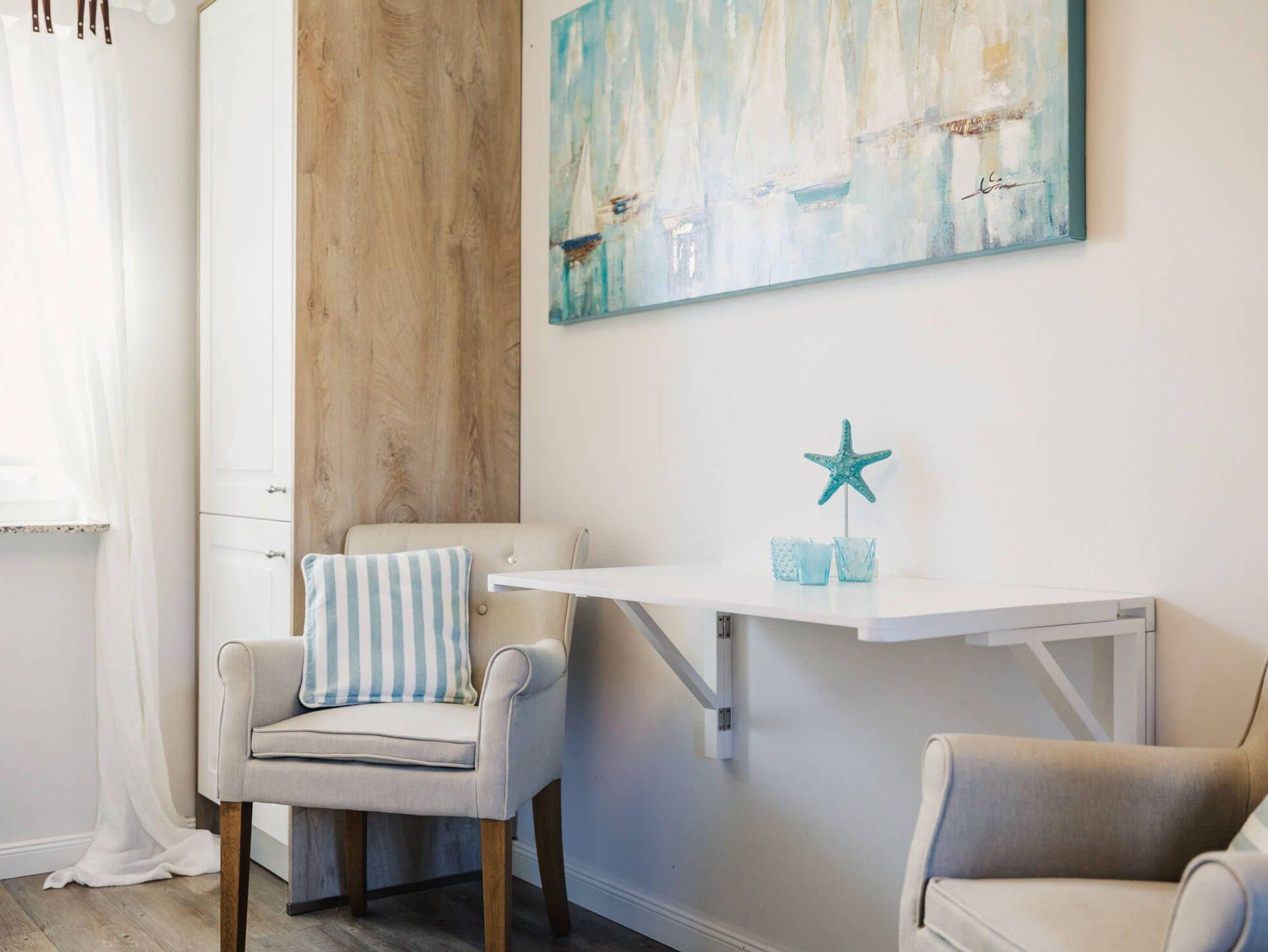 Edle Landhausoptik mit maritimen Akzenten: Lassen Sie sich vom stilvollen Ambiente mit liebevoller Dekoration verzaubern. Der Wohnraum u?berzeugt mit einer gemu?tlichen Essecke und einem modernen Flachbild-Fernseher. Entspannen Sie in unserem gemu?tlichen Apartment mit integrierter Kochnische.