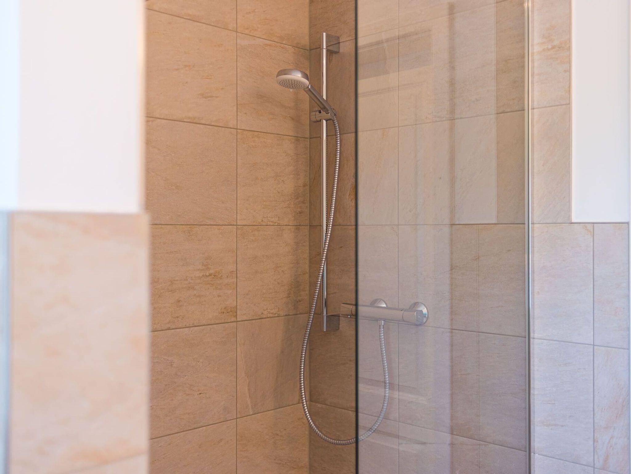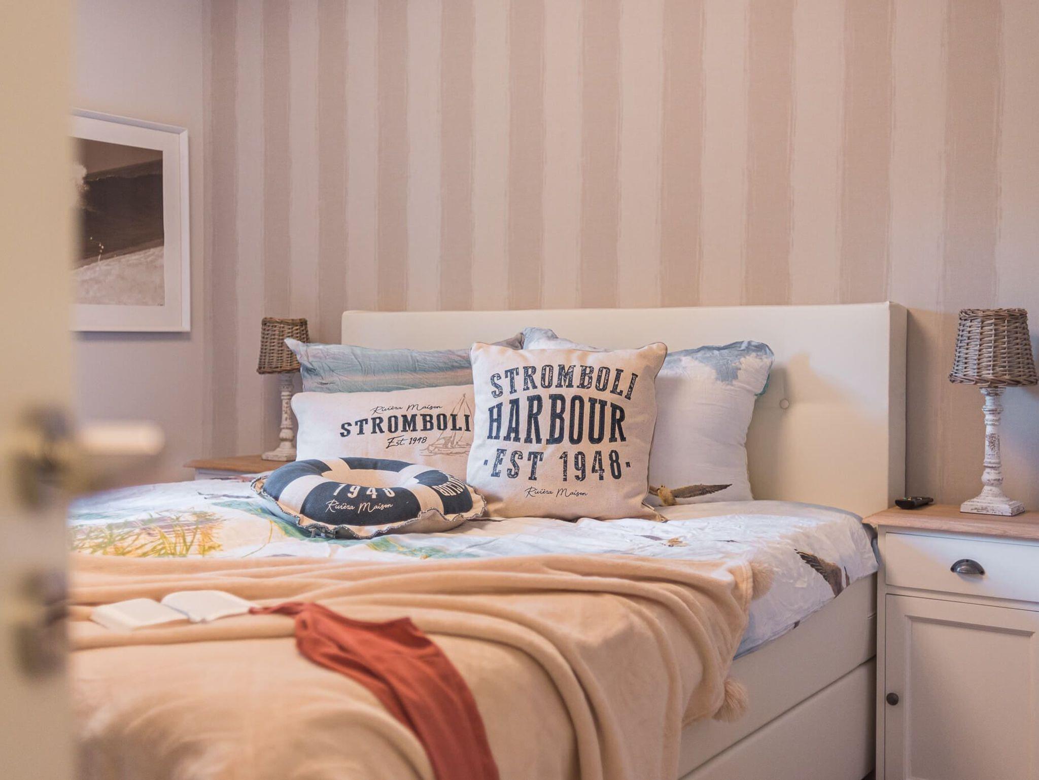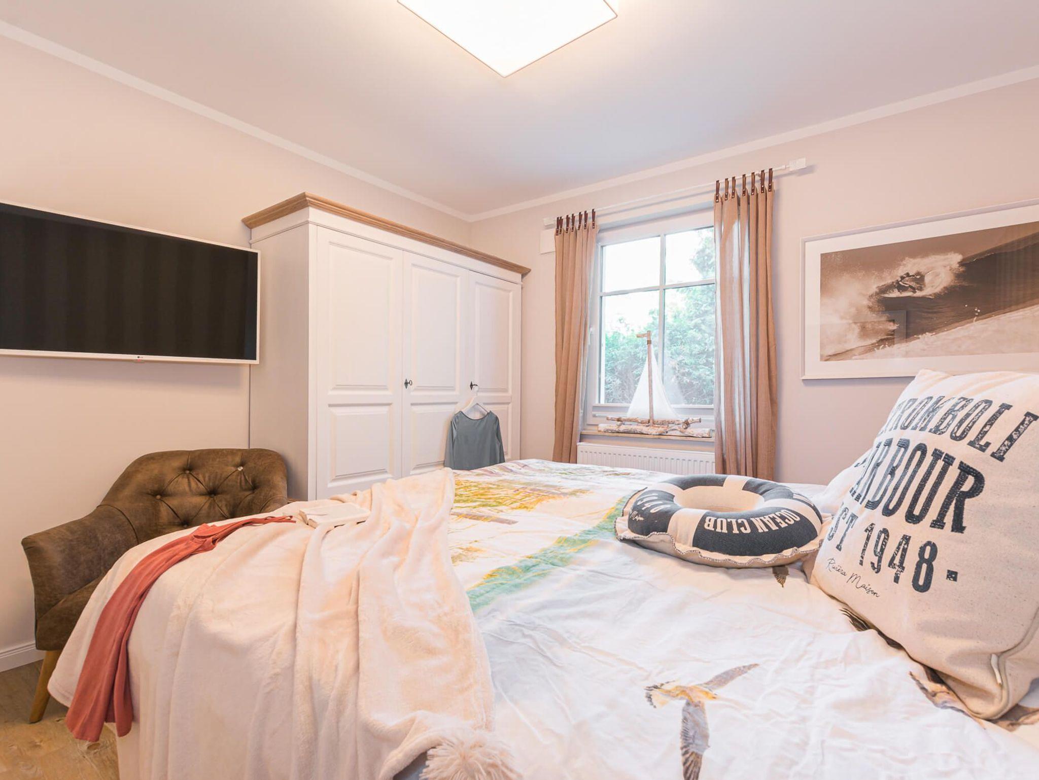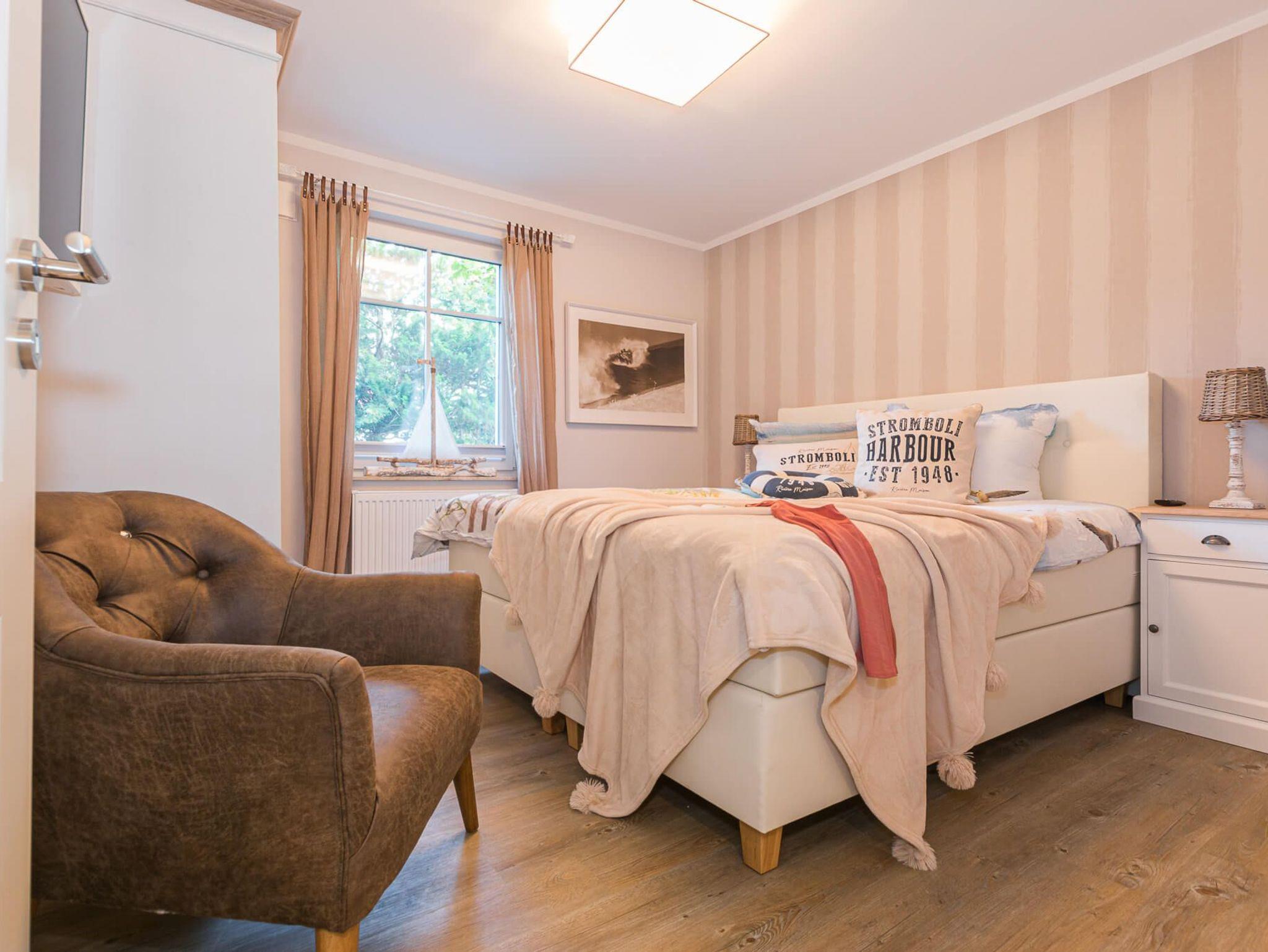 Ein Boxspringbett im Schlafzimmer bringt einen ruhigen, erholsamen Schlaf. Das Bad ist mit einer bodengleichen Dusche und einen Föhn ausgestattet.