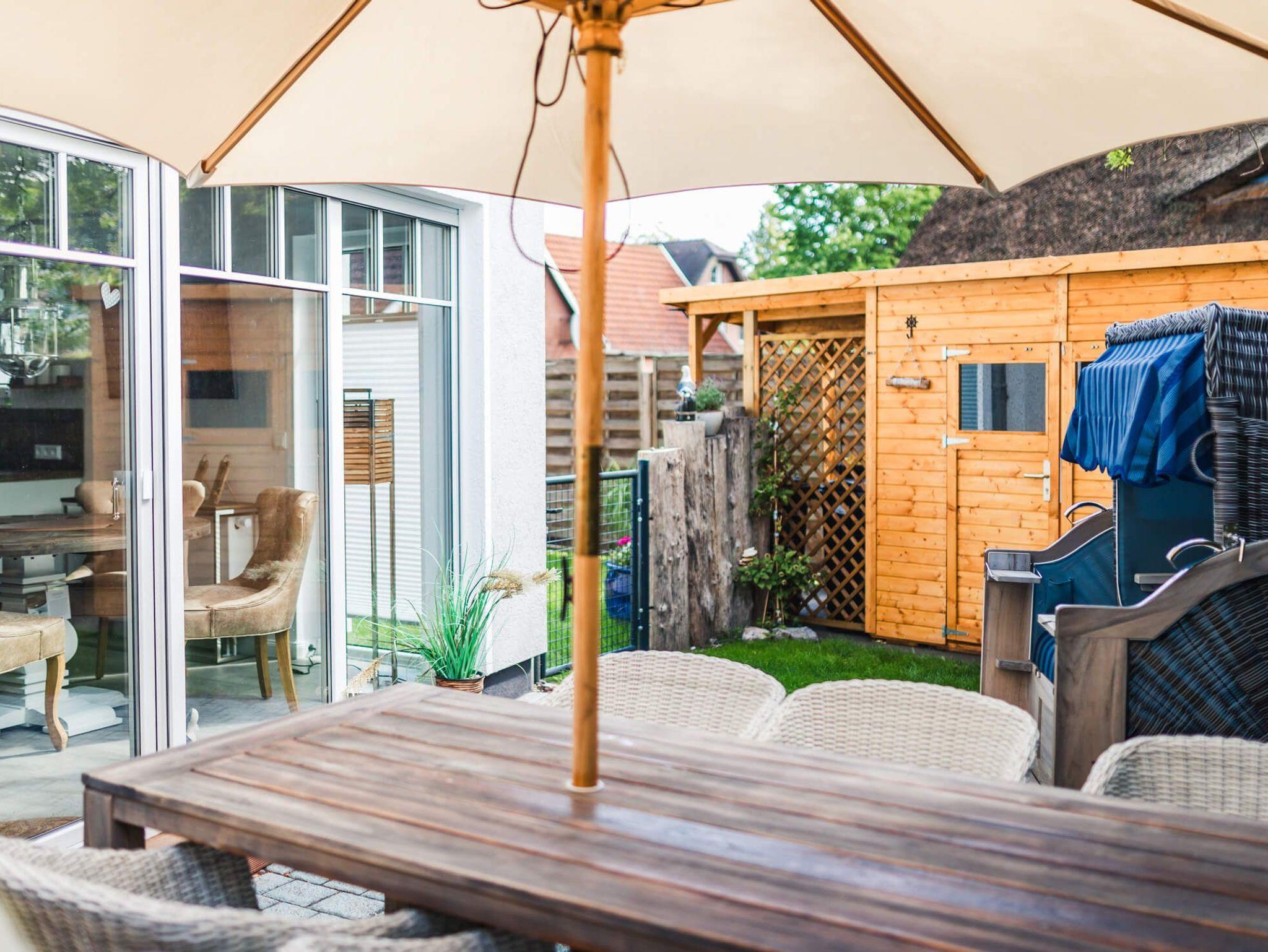 Erholung verspricht auch das Verweilen auf der vor Blicken geschützten geschlossenen Terrasse mit schönen Terrassenmöbeln, Sonnenschirm und Strandkorb.