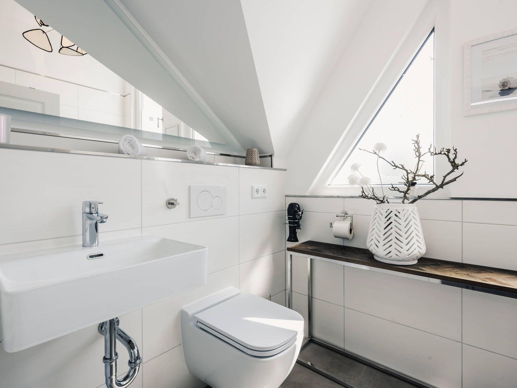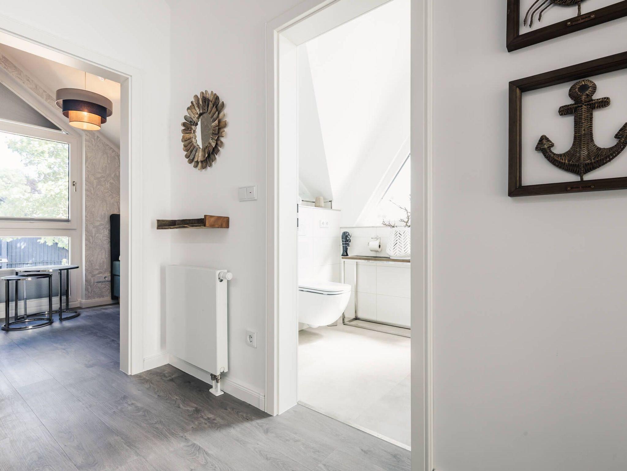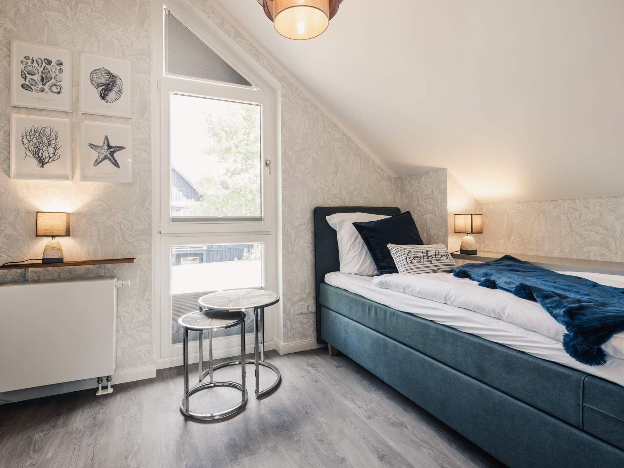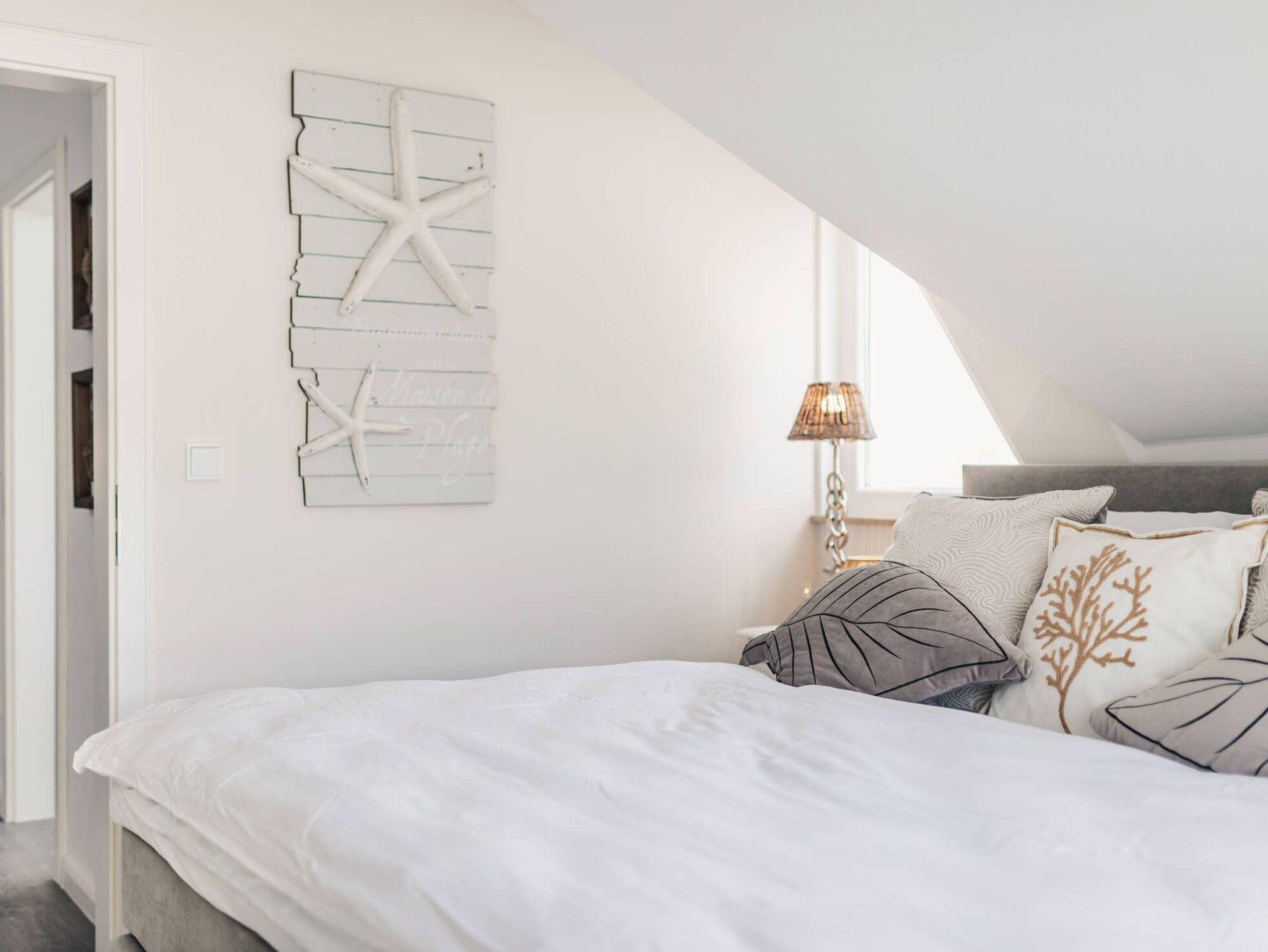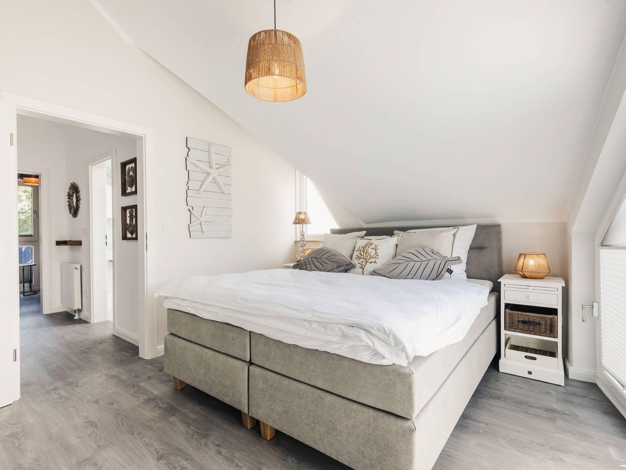 Im Obergeschoss finden Sie ein modernes ansprechendes Wannenbad vor. In beiden Schlafräumen laden komfortable Boxspringbetten zum erholsamen Schlaf ein. Sie finden neues Mobiliar sowie elegante und zugleich maritime Accessoires vor. Weitere zwei bequeme Schlafplätze bietet die hochwertige Schlafcouch im Wohnbereich.