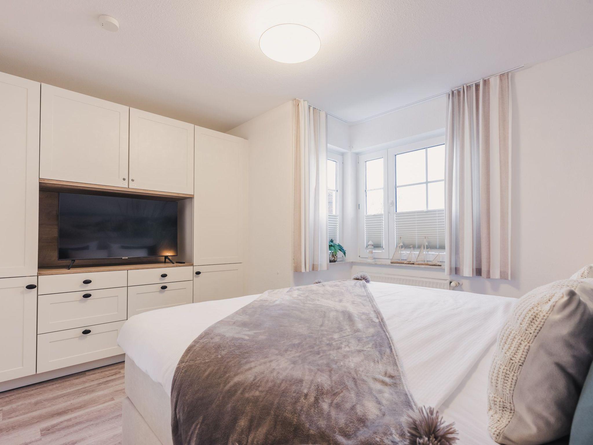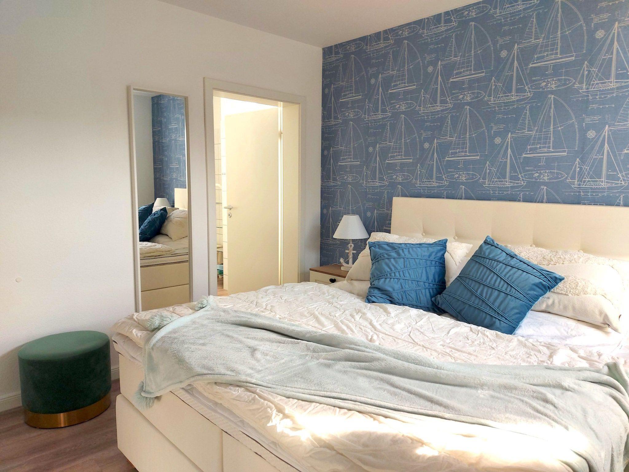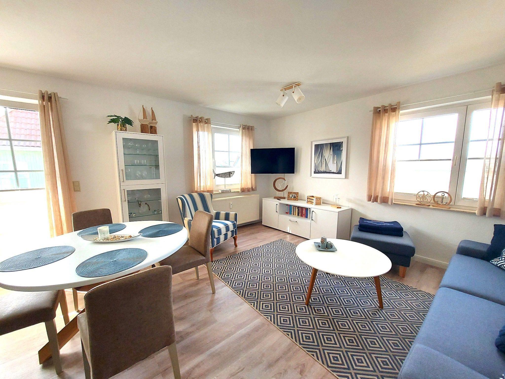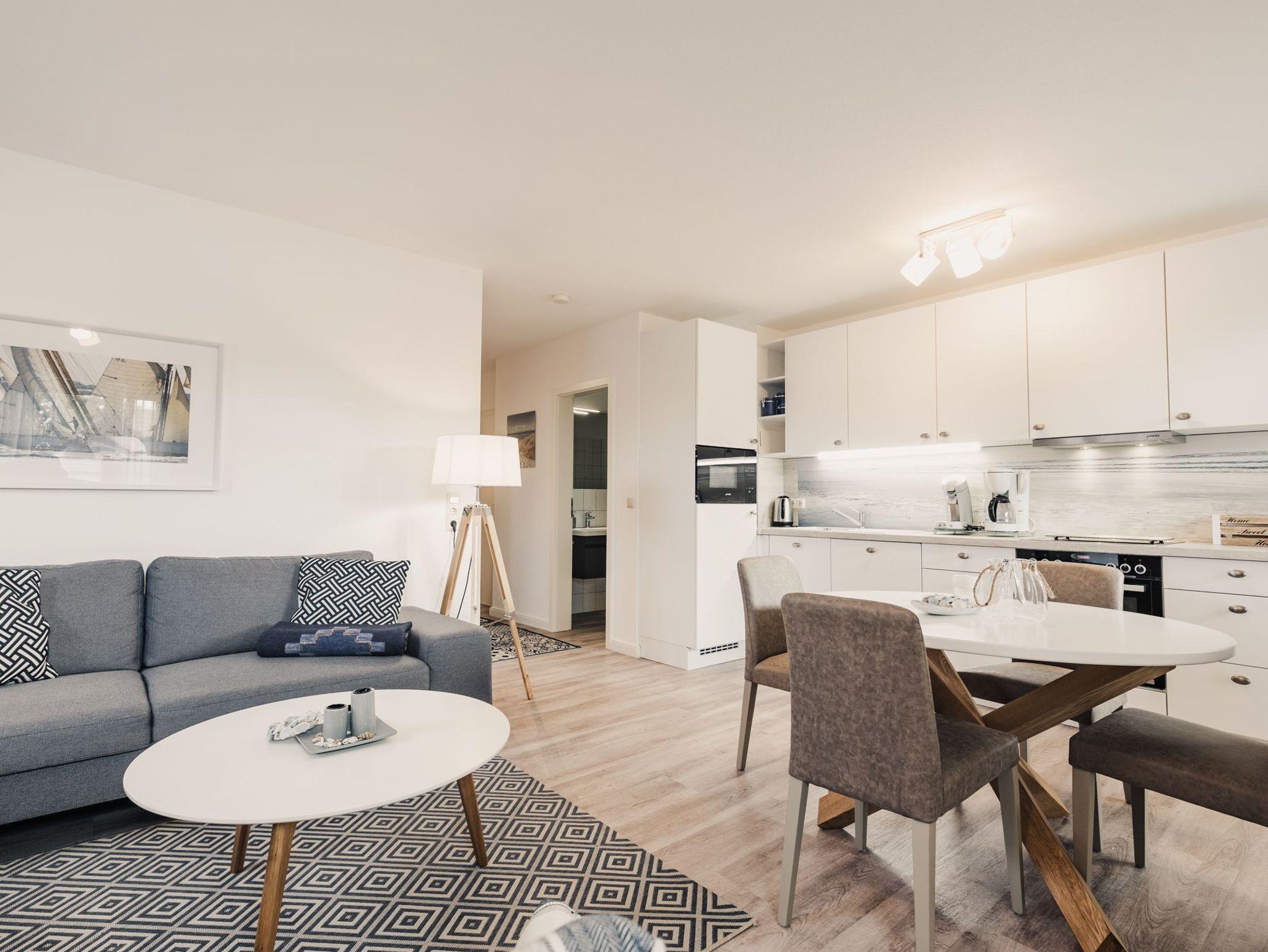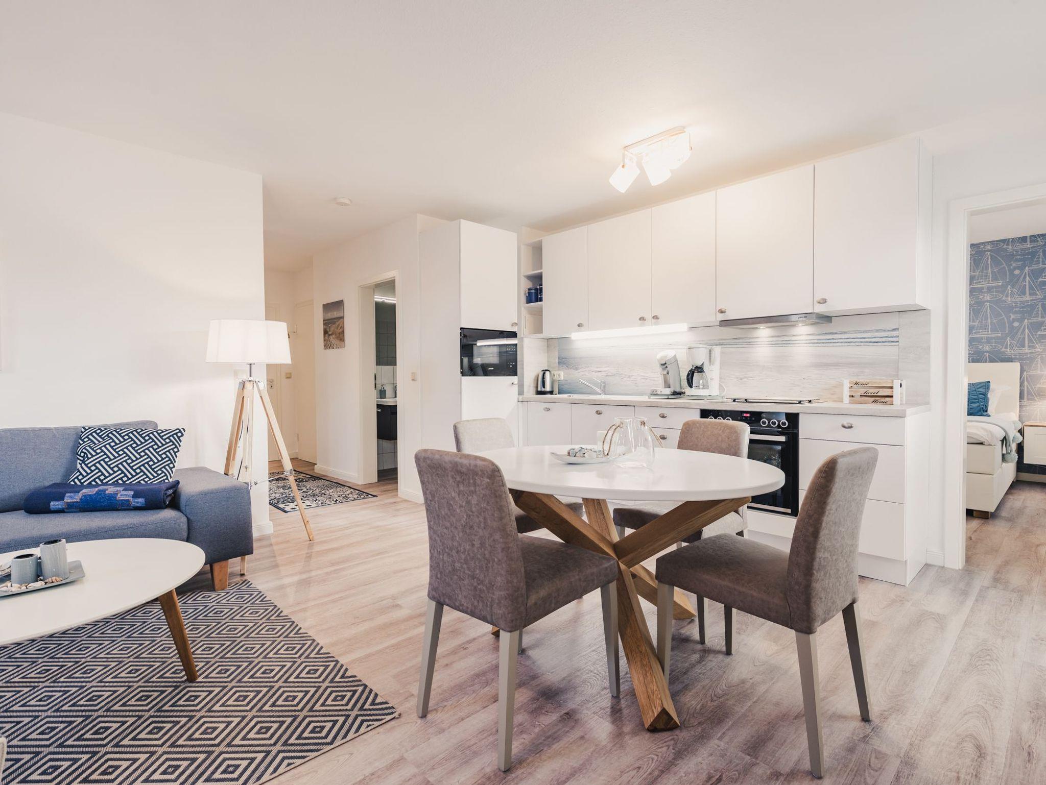 Der Wohnbereich der Wohnung besticht durch klare Linien mit maritimen Deko Elementen, hier verbringen sie gemütliche Abende. Auf dem Balkon können Sie den Tag in aller Ruhe mit einem Frühstück in der Sonne beginnen oder entspannt den Abend ausklingen lassen. Zwei voll Bäder mit WC und Dusche runden den hohen Standard ab.