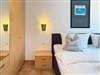 • Schlafzimmer: Ein Schlafzimmer mit komfortablem Doppelbett (Boxspringbett 180 x 200 cm) und Zugang zum Balkon mit Meerblick