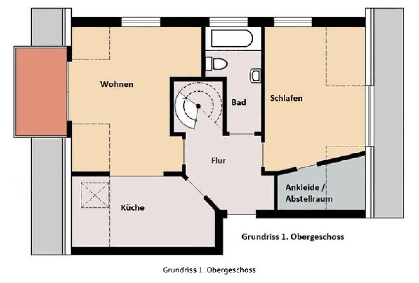 Über eine Wendeltreppe gelangen Sie in den Spitzboden der Eigentumswohnung. In diesem finden Sie ein Schlafzimmer mit Doppelbett, TV sowie einen offenen Ankleidebereich.