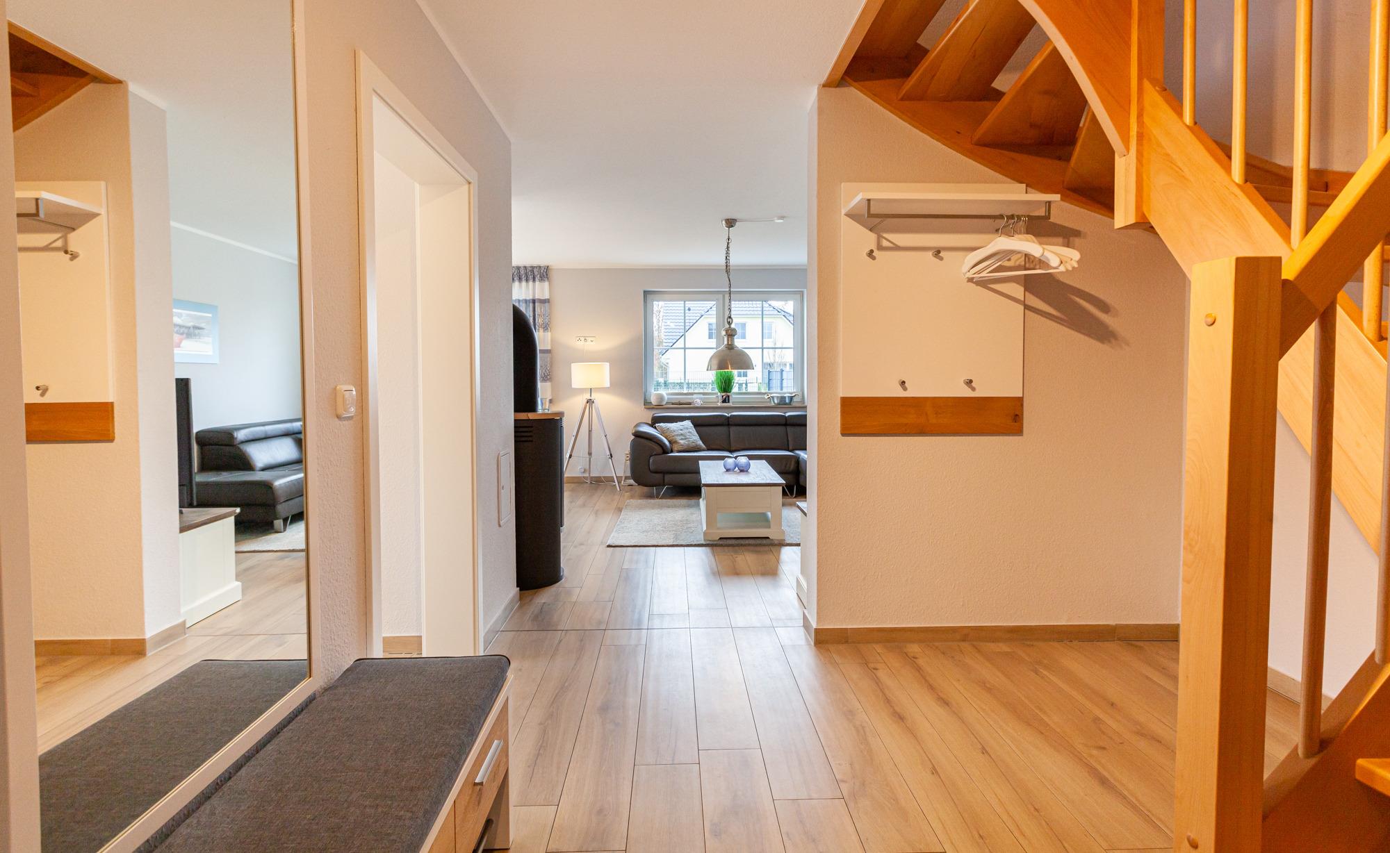 ... und ist ausgestattet mit drei Schlafräumen (1x1 Doppelbett, 1x1 Doppelbett, 1x2 Einzelbetten) jeweils mit zusätzlichen Verdunklungsmöglichkeiten, einem Wohnbereich mit Kamin und einer Küchenzeile (Mikrowelle, Cerankochfeld, Backofen, Kühlschrank mit Gefrierfach, Spülmaschine, Kaffeemaschine), zwei Bädern (1 x bodengleiche Dusche / WC und Sauna,