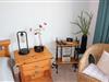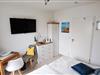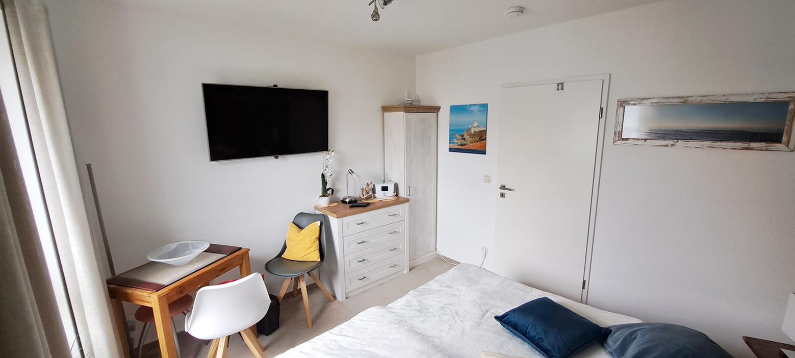 modernes 2. Schlafzimmer mit 2 Einzelliegen, großer HD-TV, WLAN-Radio und Schreibtisch, kleiner Kleiderschrank und Kommode
