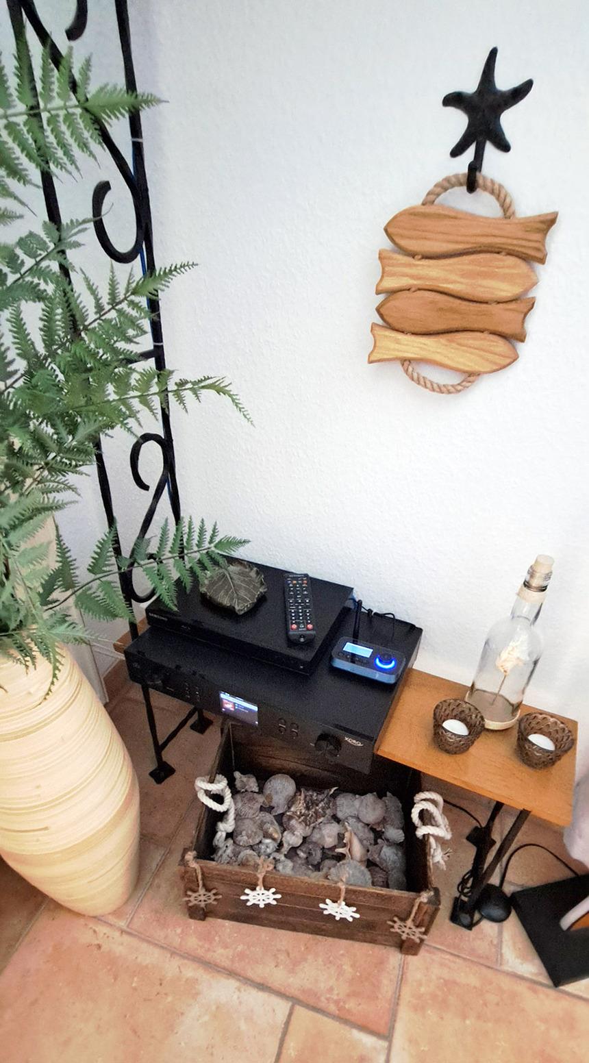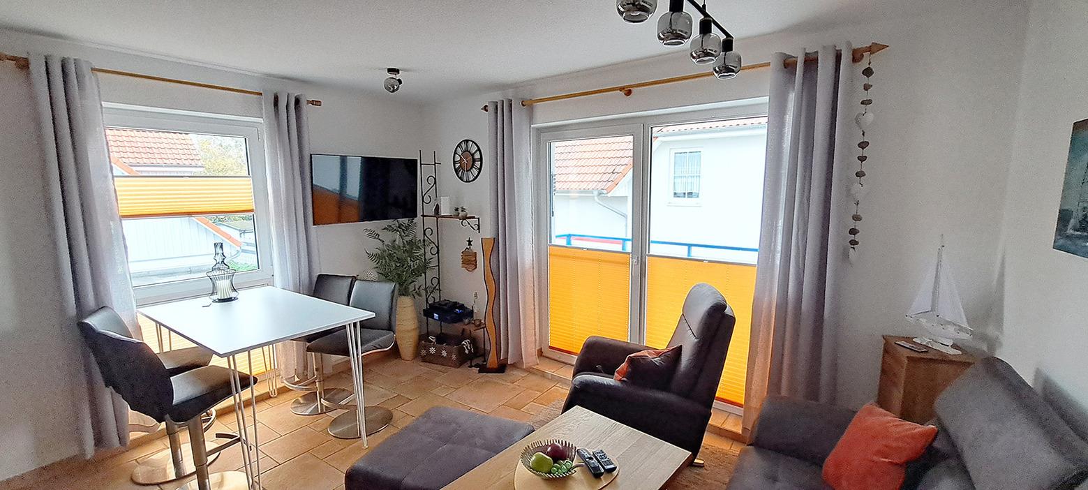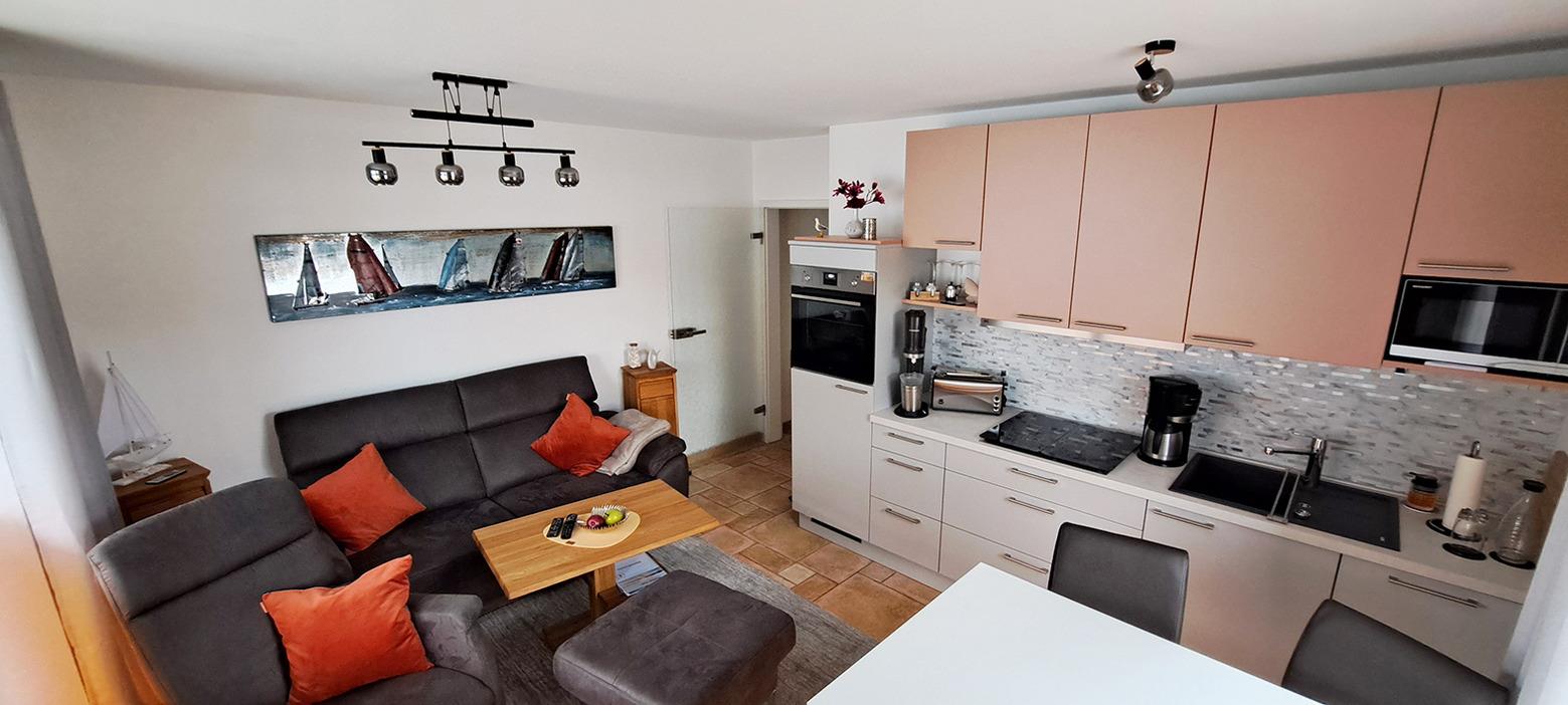 gemütliches Wohnzimmer mit kompletter Küchenzeile, Balkon 1 zur Südseite, Sat-TV (4k), Musikanlage mit Internetradio, unbegrenzter, schneller Gigabit- WLAN Zugang, BluRay Player, Geschirrspüler, Microwelle, Kaffeemaschine, Toaster, Esstisch mit 4 Barhockern,