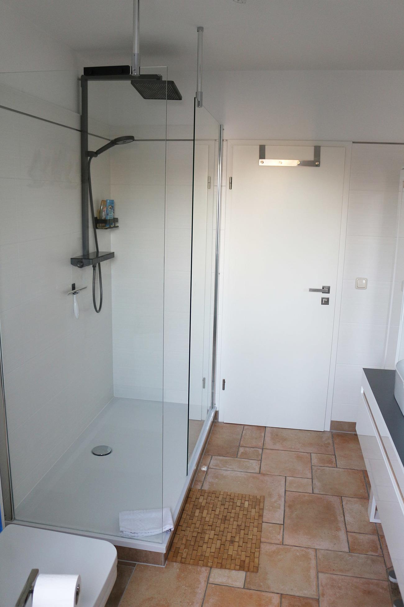 hochwertiges Badezimmer mit Walk-In Regendusche, beleuchteter großer Spiegel, Waschmaschine und WC