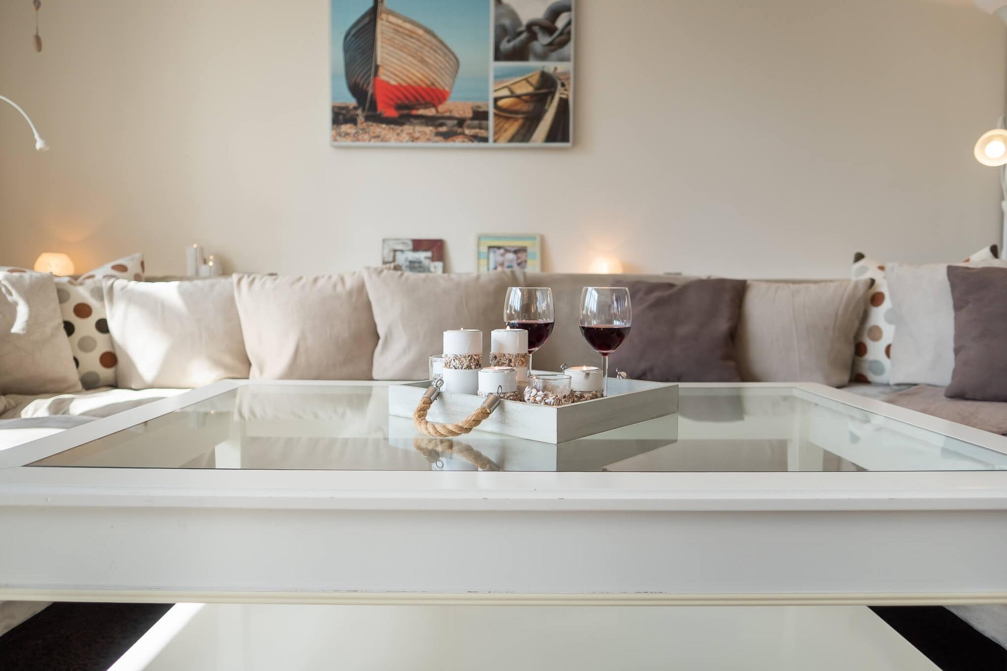 Im HWR steht eine Waschmaschine mit Trockner für Sie bereit. Alle Räume im EG haben Fußbodenheizung. Auf der nach Süd-Westen ausgerichteten Terrasse können Sie den Sonnenuntergang in bequemen Gartenmöbeln sowie einem Strandkorb genießen.