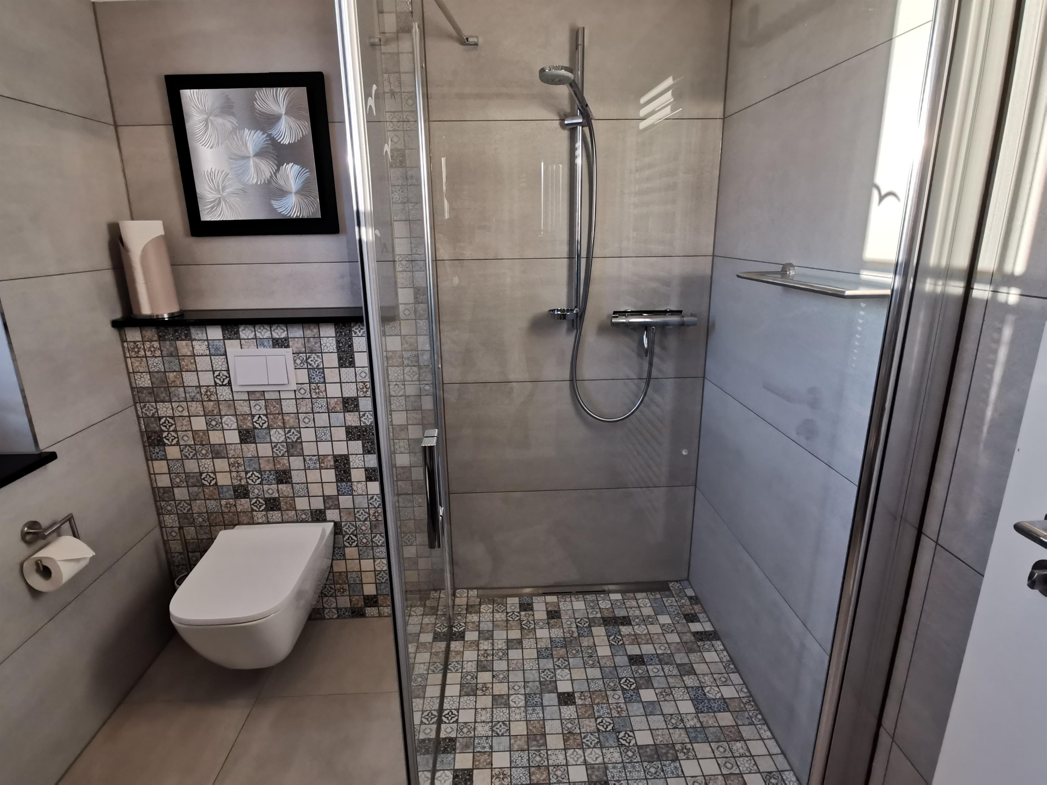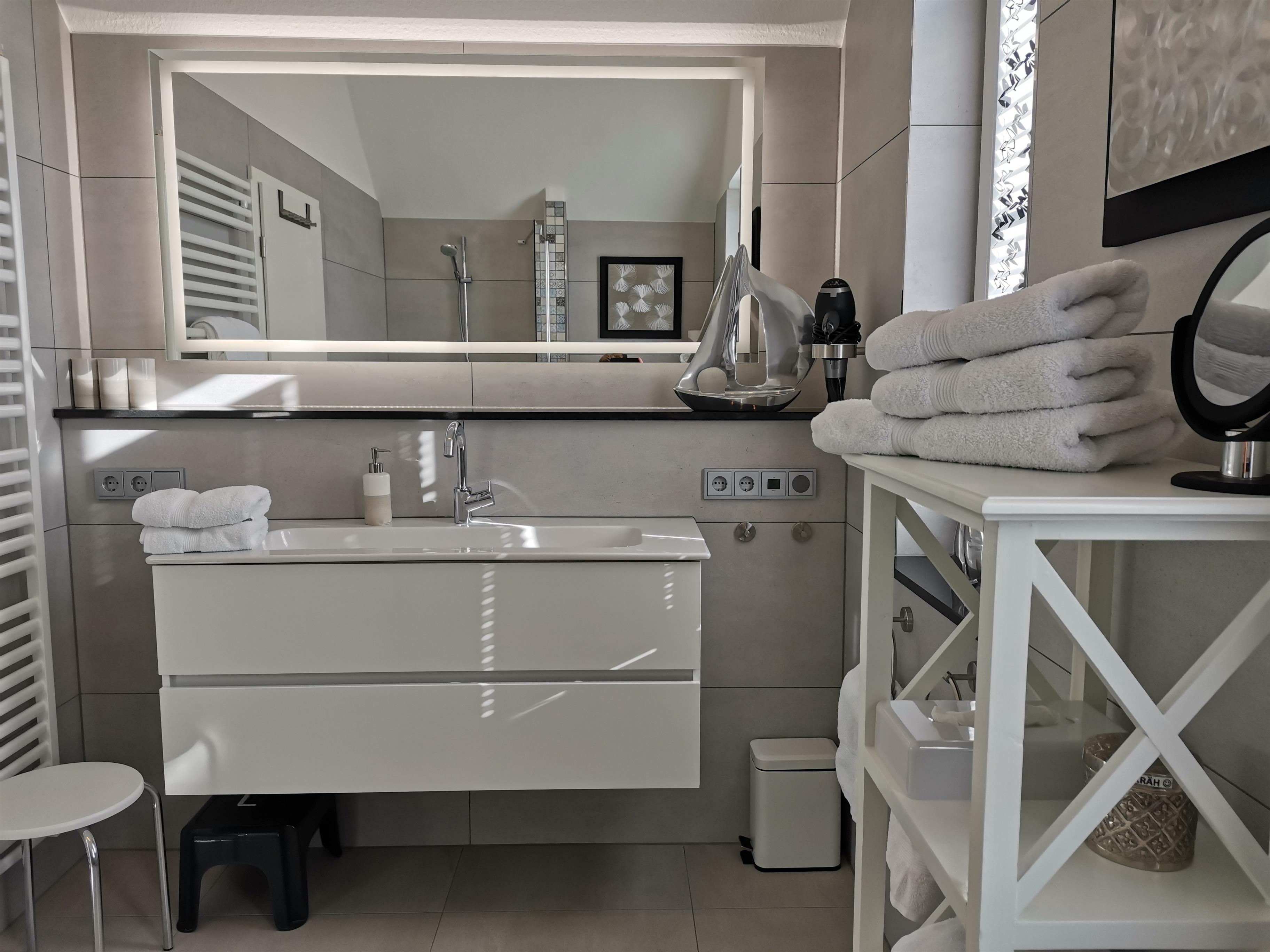 Im komfortablen, giebelhohen Bad finden Sie ein WC, übergroße, ebenerdige Dusche und beleuchteten Panoramaspiegel. Internetradio für einen beschwingten Start in den Tag! Kosmetiktücher, Schminkspiegel, Seifenspender, Fön, Sitzhocker und Toilettenpapier sind vorhanden. Handtuchtrockner mit Fussbodenerwärmung. Für Ihre Badutensilien stehen ausreichend Ablageflächen zur Verfügung.