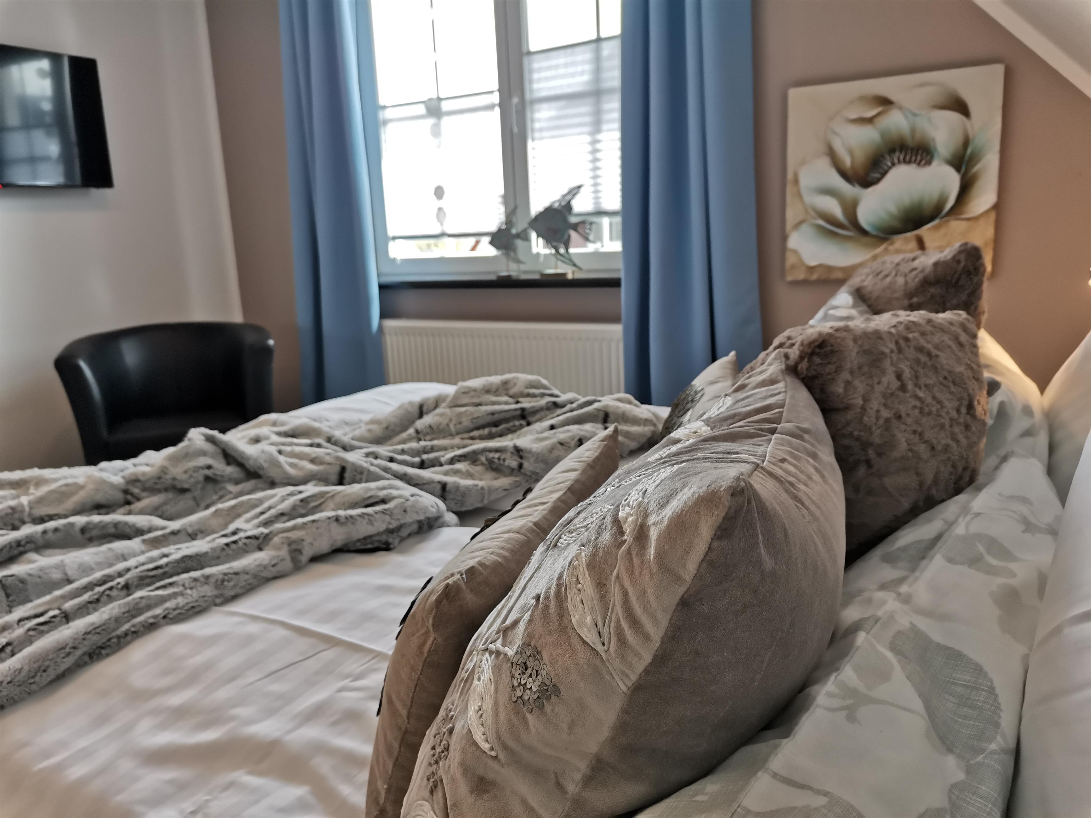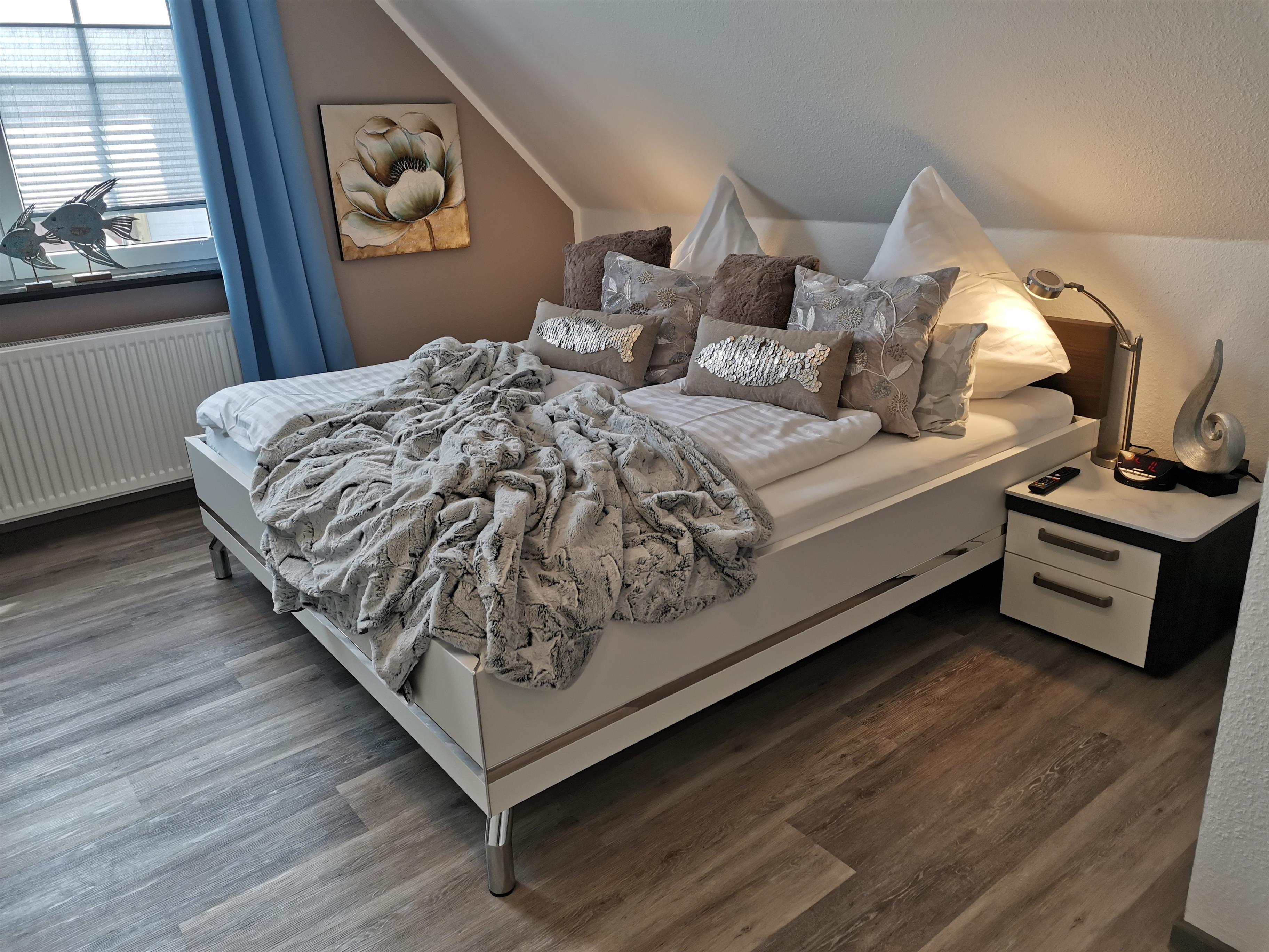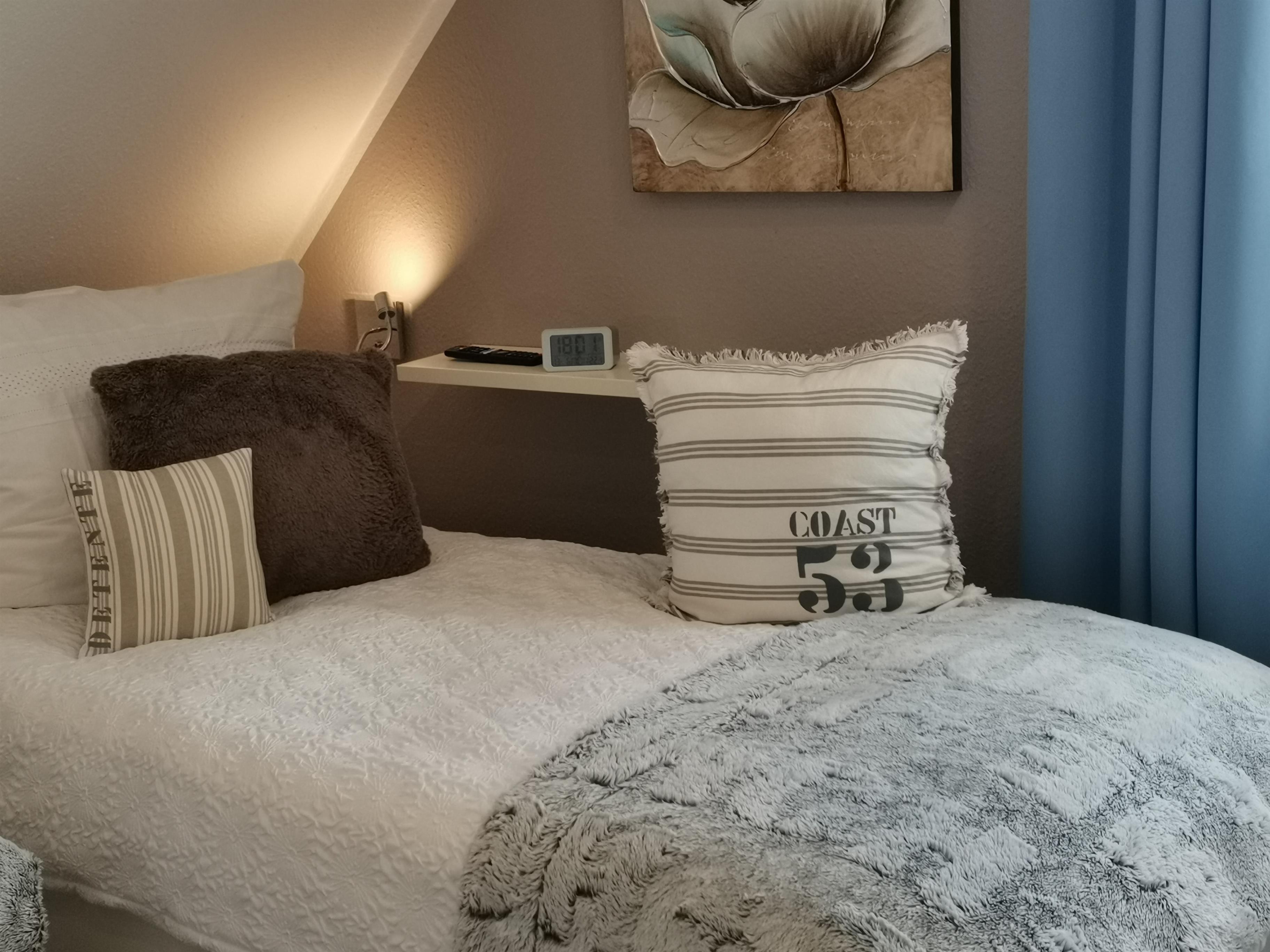 Bett komplett bezogen, 40 x 80-Kissen, 1 Duschtuch, 2 Handtücher, ausreichend Badvorleger u. Geschirrtücher.