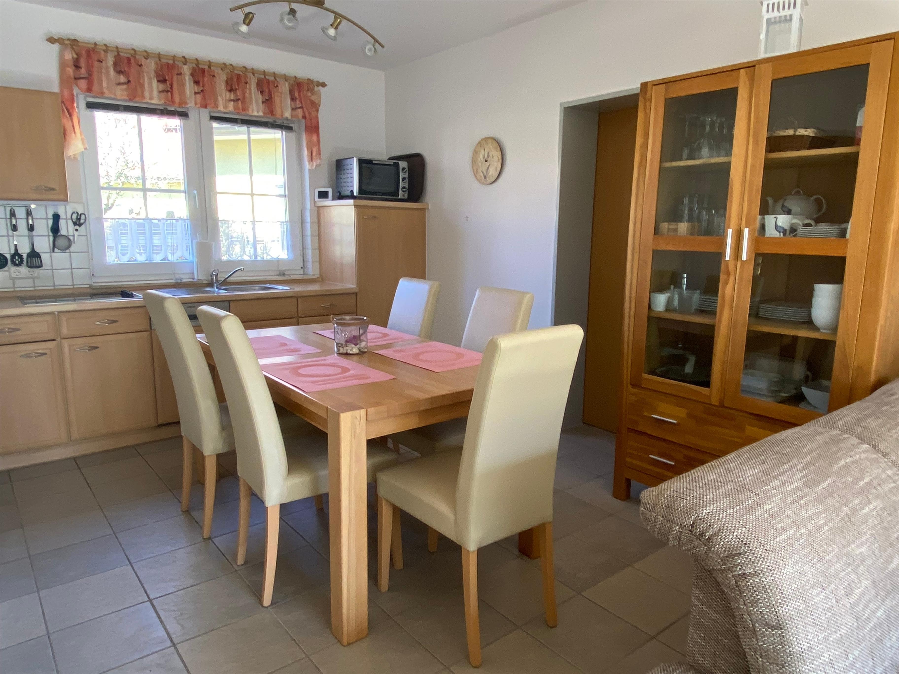 Auf gleicher Ebene befindet sich die offene Küche, ausgestattet mit Kühlschrank (incl. *** Gefrierfach),•Geschirrspülmaschine, Grillbackofen und div. Elektrogeräte (Kaffeemaschine, Wasserkocher, Toaster) und allem anderen was man so zum Kochen benötigt. Angrenzend befindet sich die Essecke für 5 Personen.