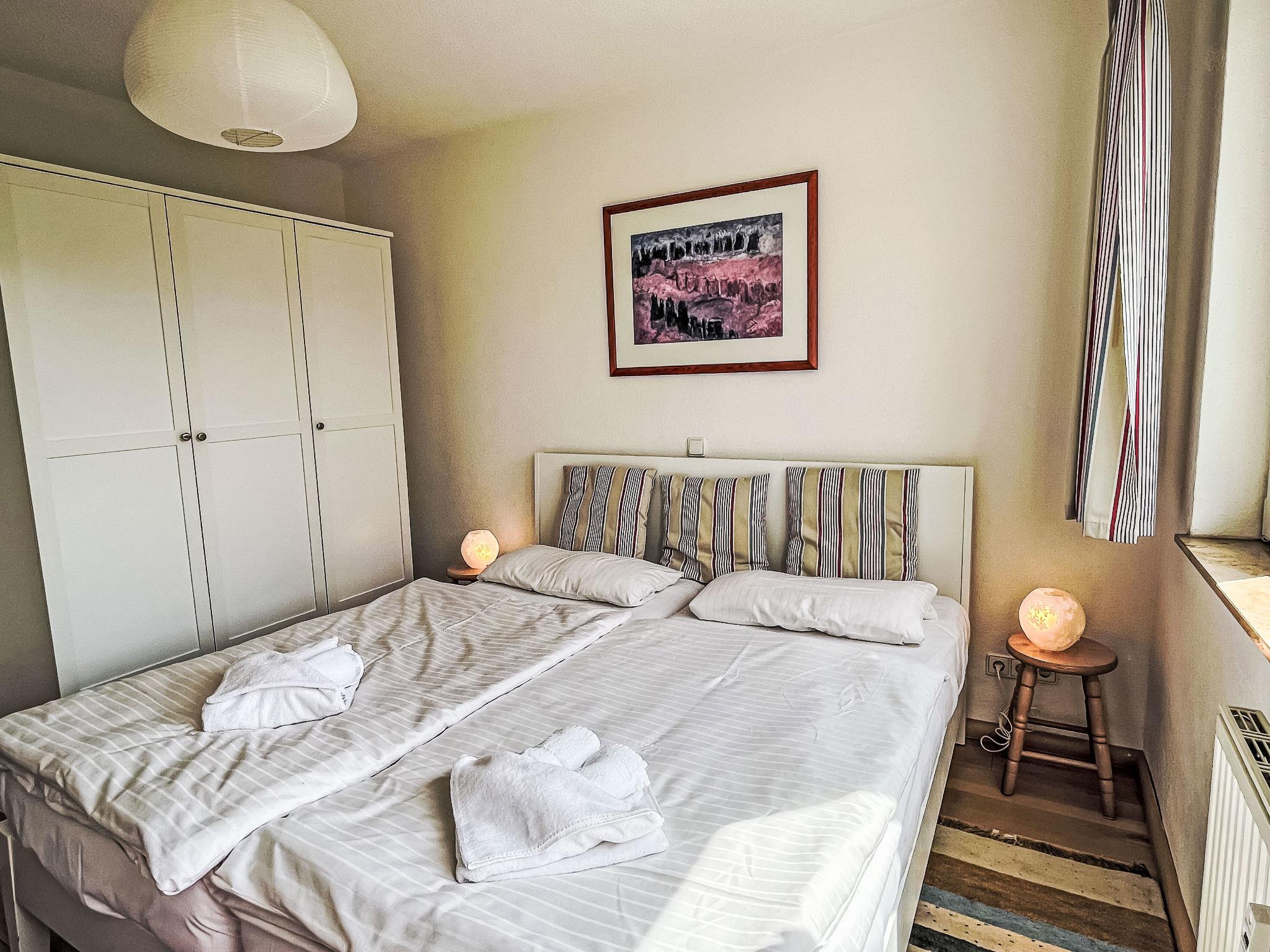 "Karsten", 2-Zimmer-Wohnung 50 m2 im 2. Stock. Wohn-/Esszimmer mit Kabel-TV (Flachbildschirm), Radio. Ausgang zum Balkon. 1 Zimmer mit 1 Doppelbett. Kleine Küche (Backofen, 4 Glaskeramikplatten, Mikrowelle). Dusche/WC. Balkon. Balkonmöbel. Parkplatz (1 Auto) beim Haus. Bitte beachten: Nichtraucher-Unterkunft. Rauchmelder.