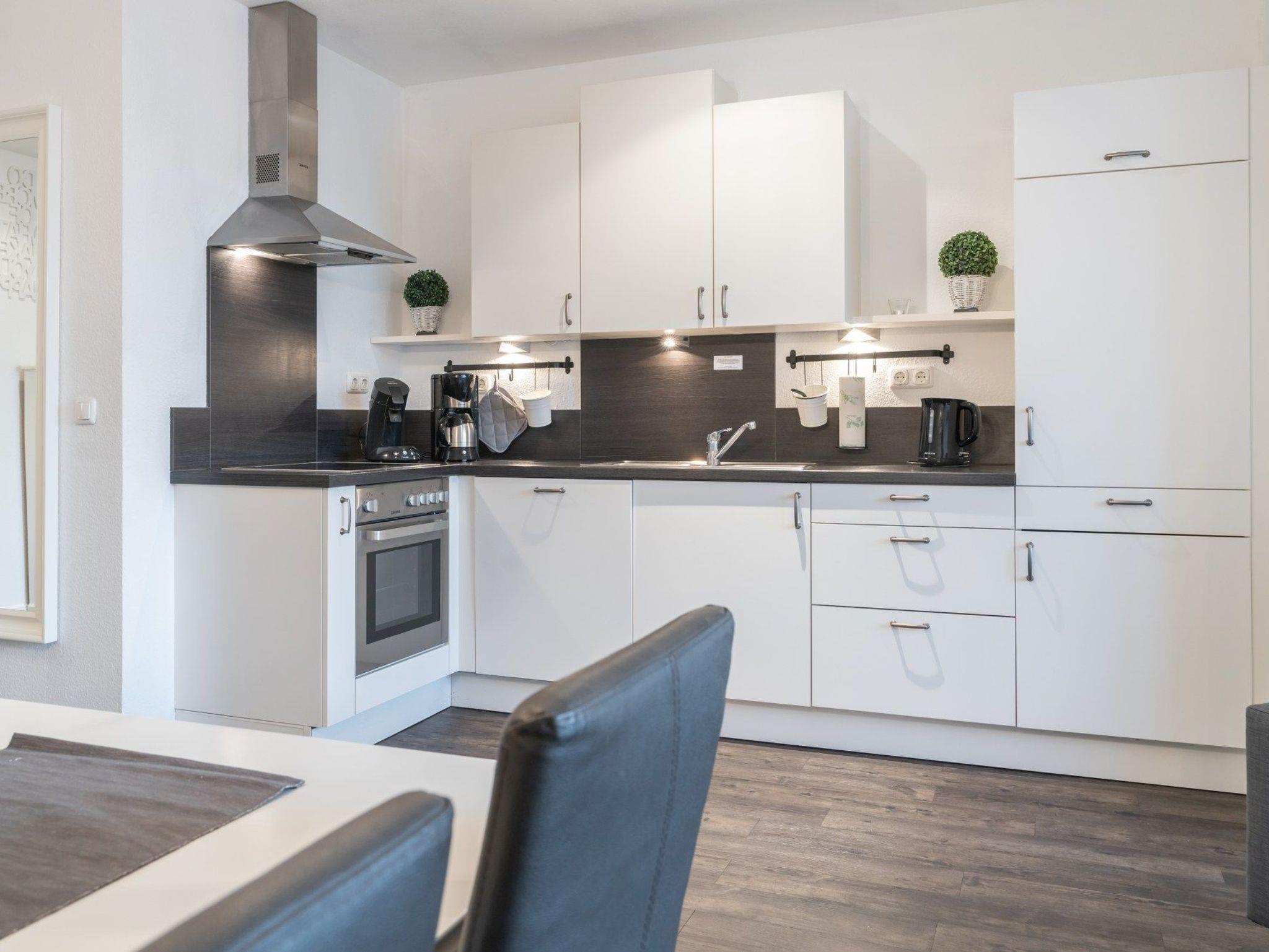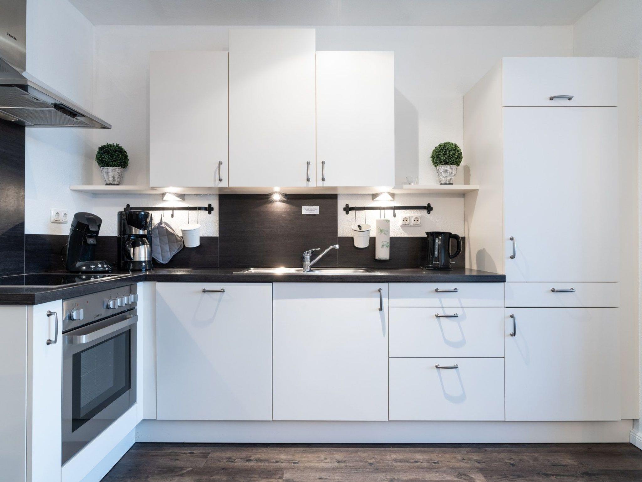 Die hier angrenzende Küchenzeile ist mit einem Kühlschrank mit Gefrierfach, einem Geschirrspüler und einem Backofen mit Cerankochfeld ausgestattet. Eine Kaffeemaschine, ein Toaster und ein Wasserkocher stehen Ihnen hier selbstverständlich zur Verfügung.