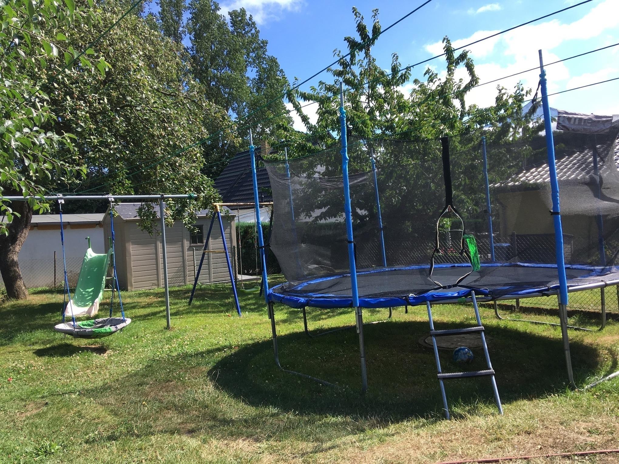 Zum Haus gehört eine Terrasse mit Gartenmöbeln, Spielplatz mit Trampolin, Sonnenschirm und Grill.