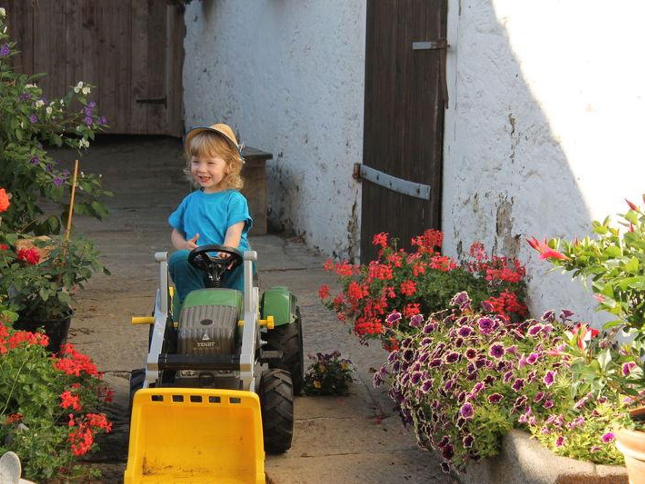 Ein Paradies für Groß und Klein. Ob Schaukeln, Kettcar fahren, Sandburg bauen, auf dem Holzturm Verkleiden spielen, Traktor fahren, Riesentrampolin springen – den Kindern wird der Tag immer zu kurz. Bei schlechtem Wetter bieten die Spielscheune mit Heurutsche und Hängematte, sowie das Spielzimmer mit Tischtennis und Fußballkicker viel Abwechslung.