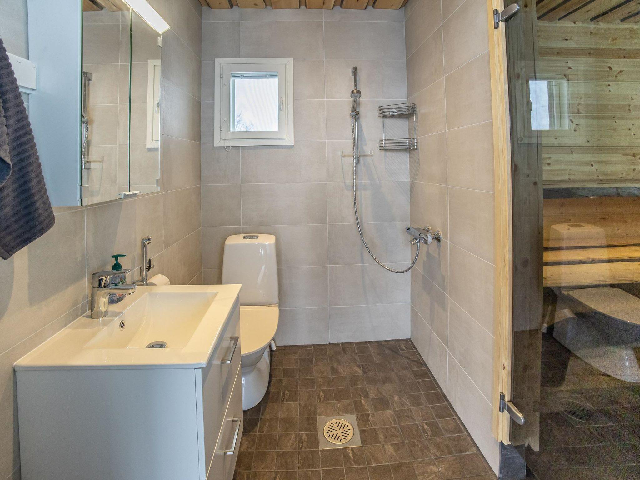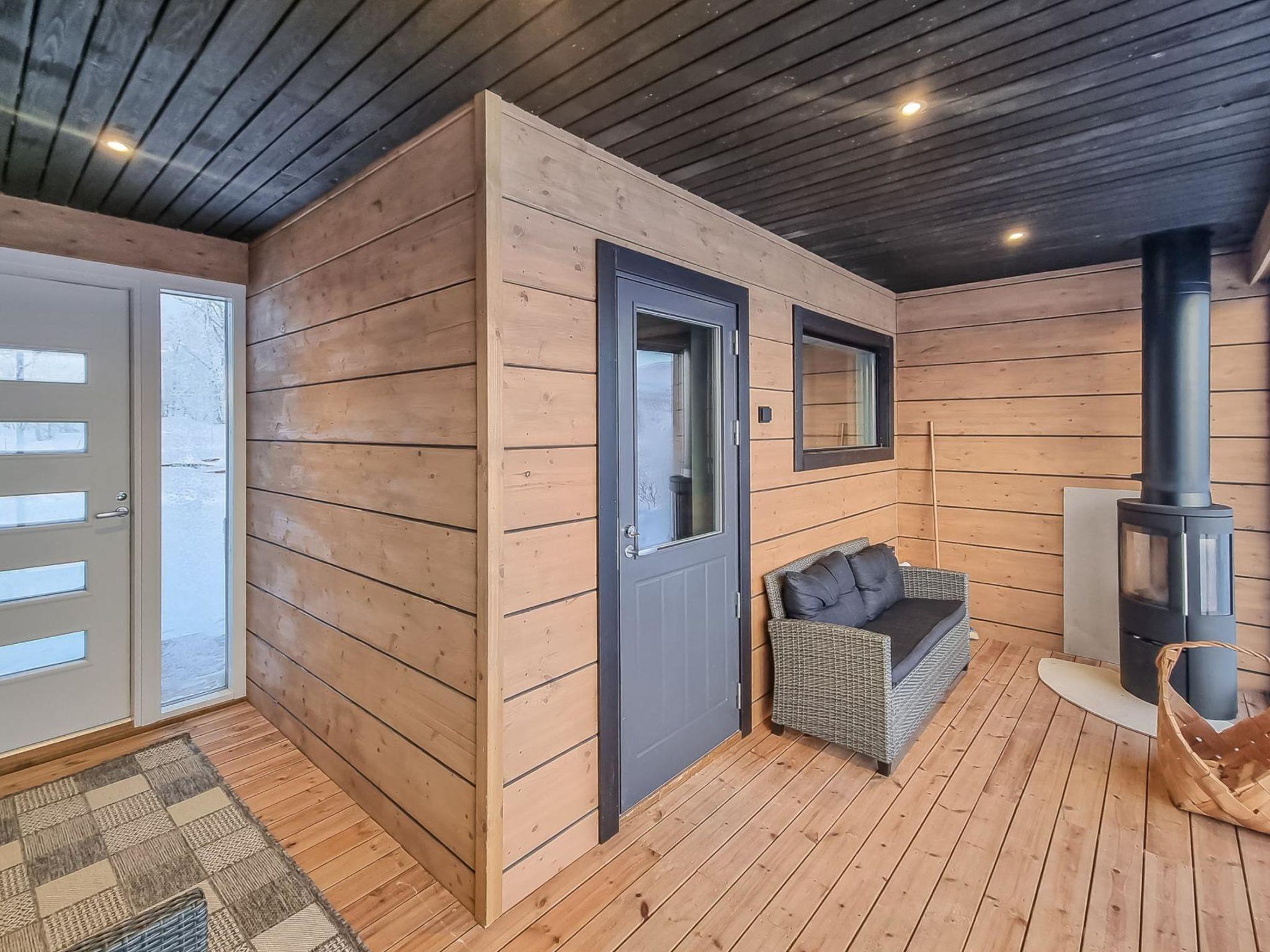 On one side, there is a comfortable living and sleeping area having convenient spreadable sofa bed that can be converted into two separate 80 cm wide beds. On the other side, you'll find the washroom with shower and a traditional wood-heated sauna. The sauna has a window offering stunning views of the lake and fells.