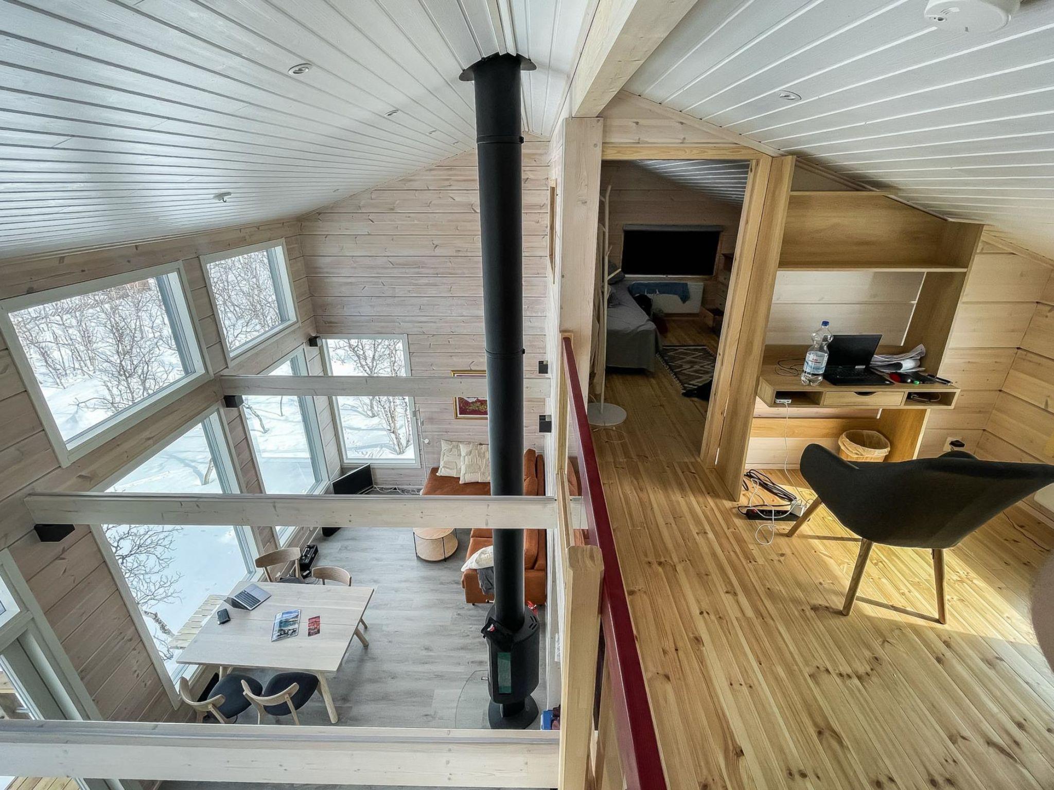 Upon entering, you'll immediately notice the spacious living room/kitchen, equipped with gourmet-level amenities, inviting you to cook and spend time together. The ground floor bedroom features a comfortable double bed, and there is also a bathroom with a shower downstairs. On the upper floor, you'll find another bedroom with two single beds, and a desk area in the hallway if you need a quiet spot to work. An additional mattress is available if needed.